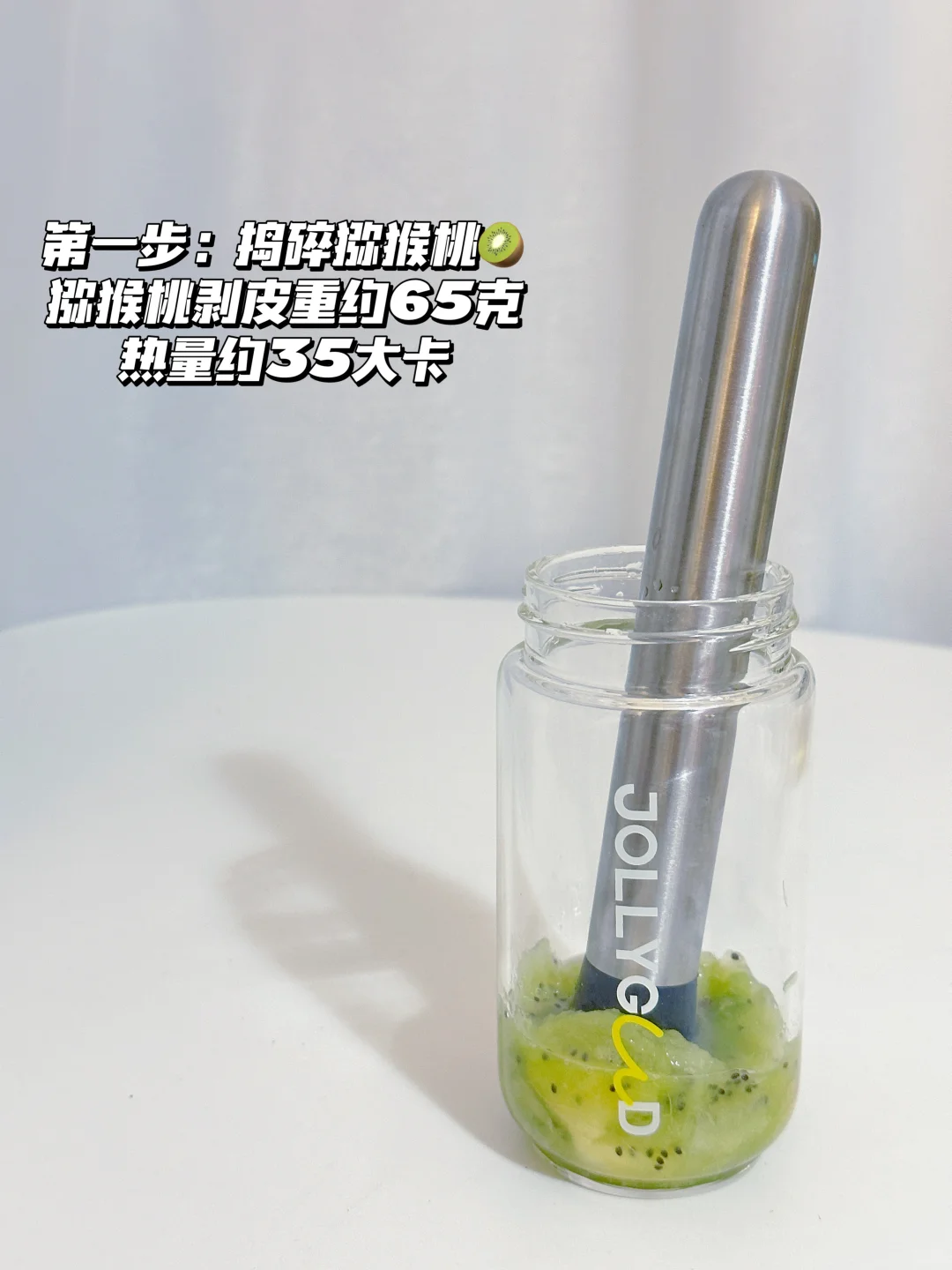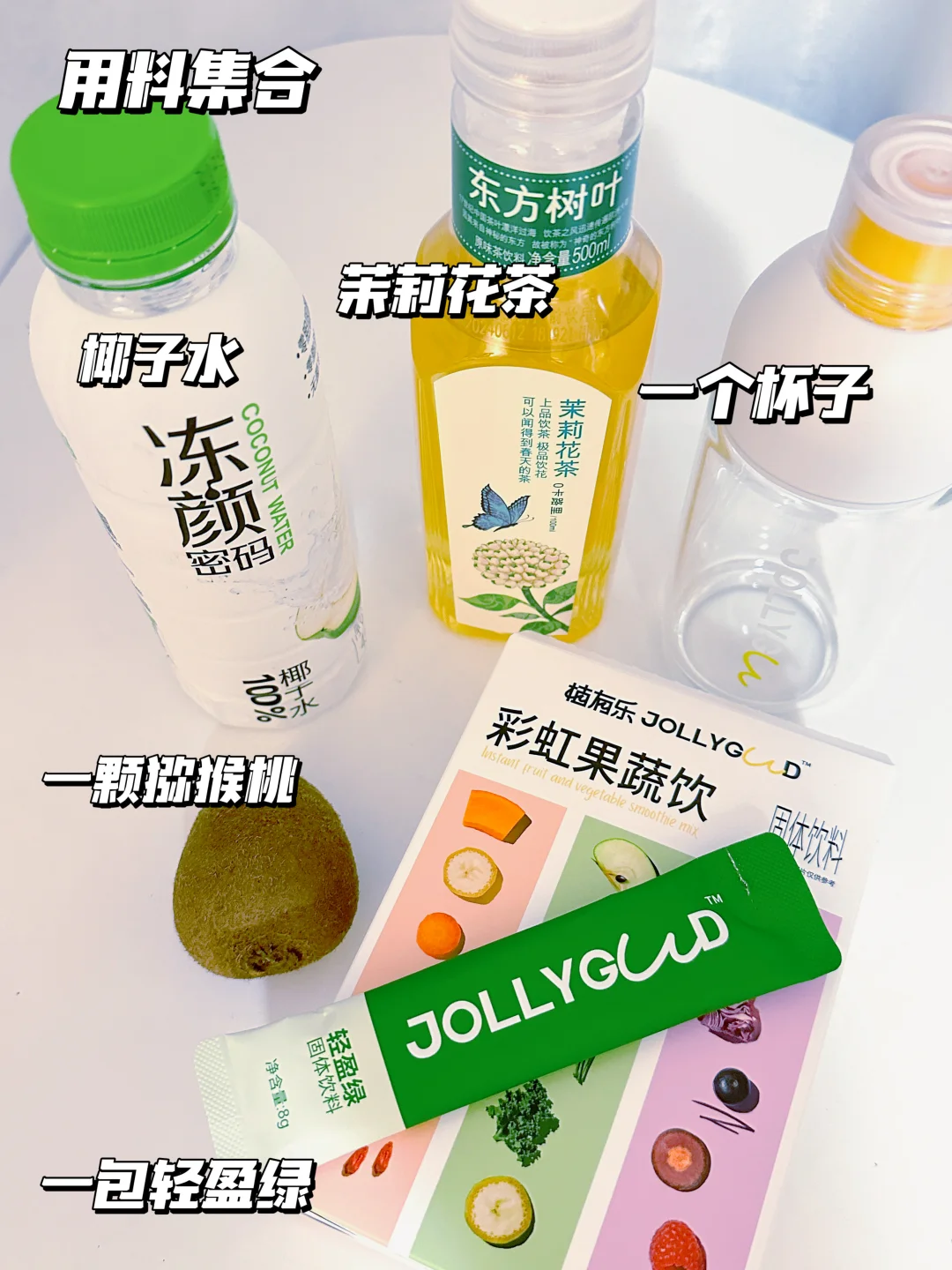 需要准备一包轻盈绿、一颗猕猴桃🥝、一瓶椰子水、一瓶茉莉花茶,以及一个杯子和捣汁锤✔