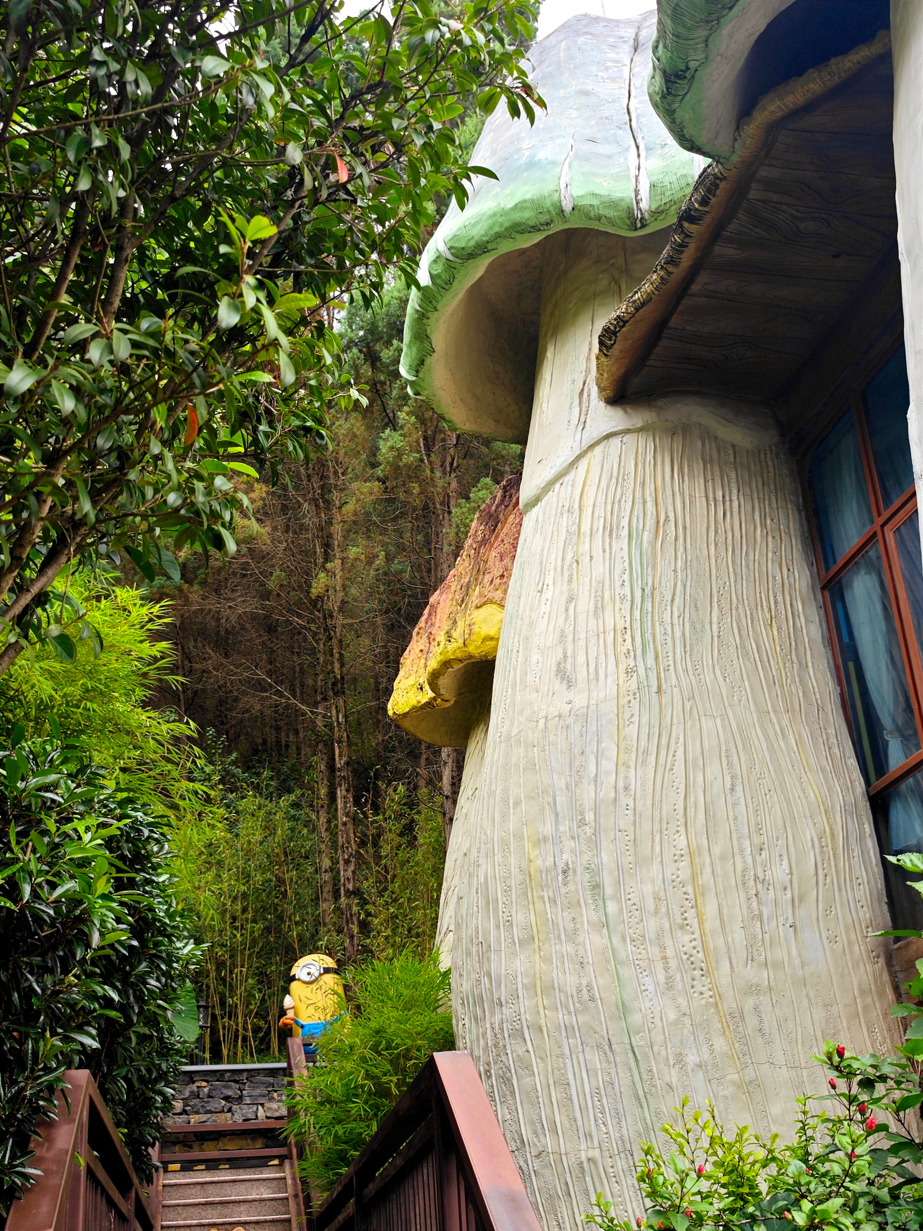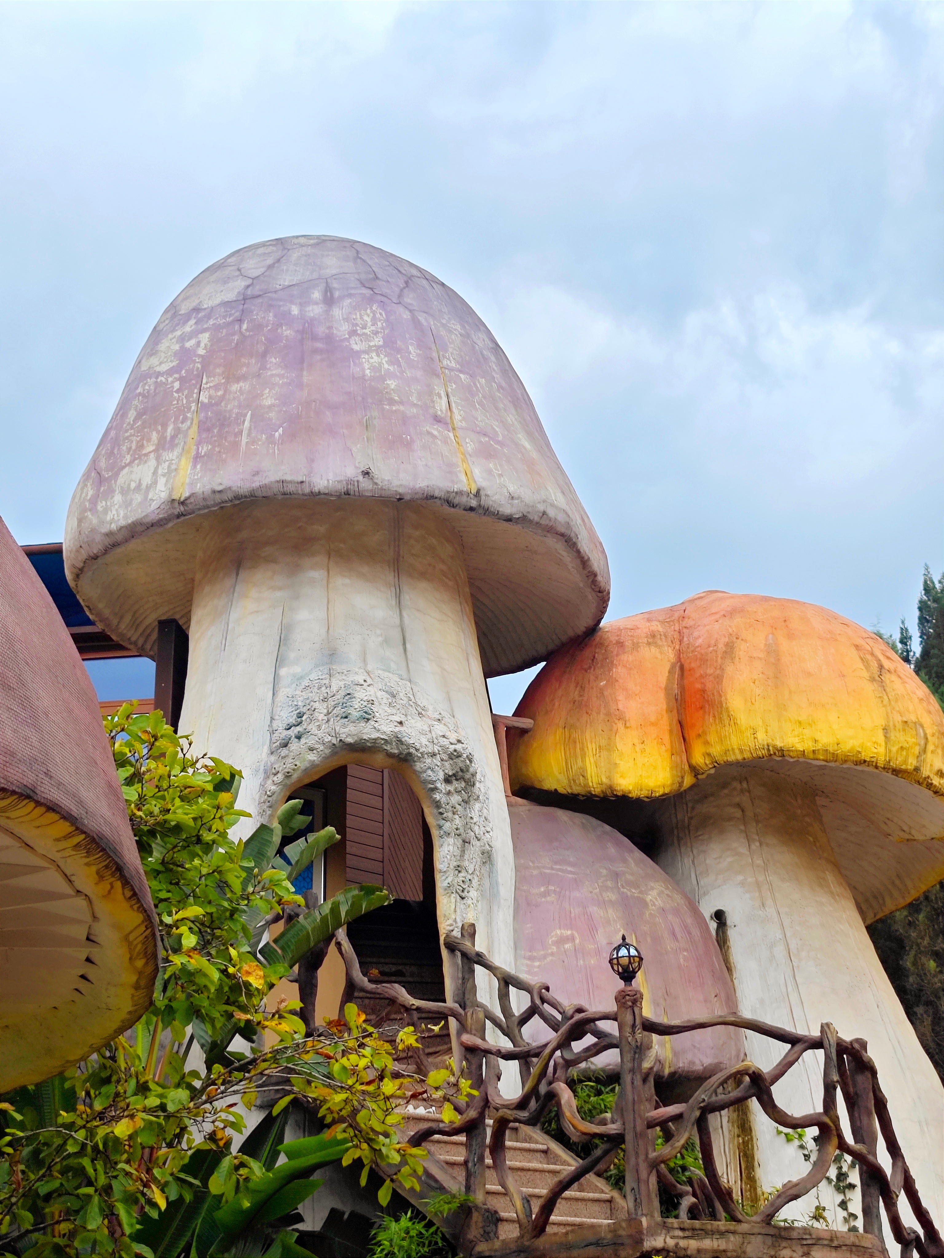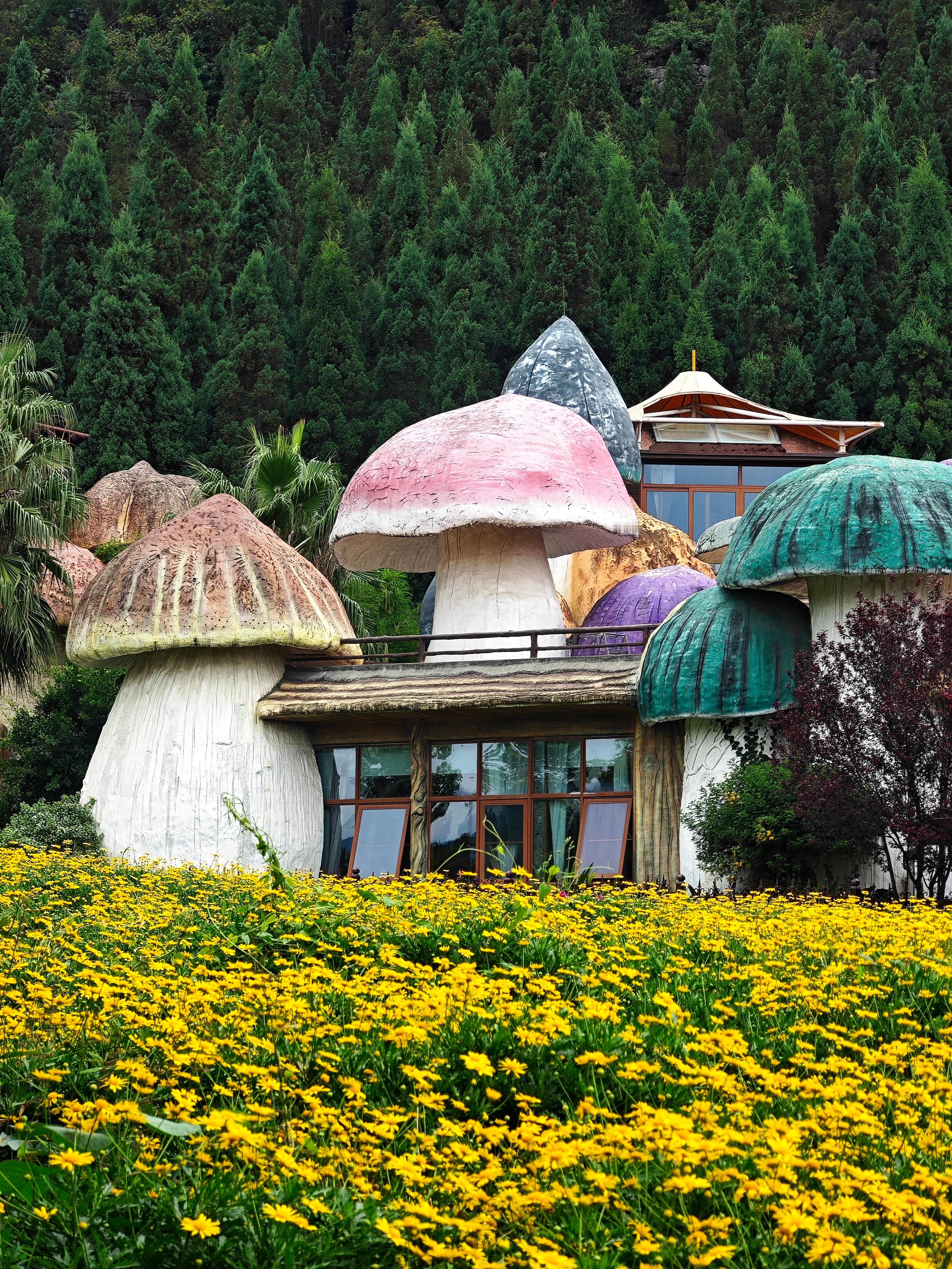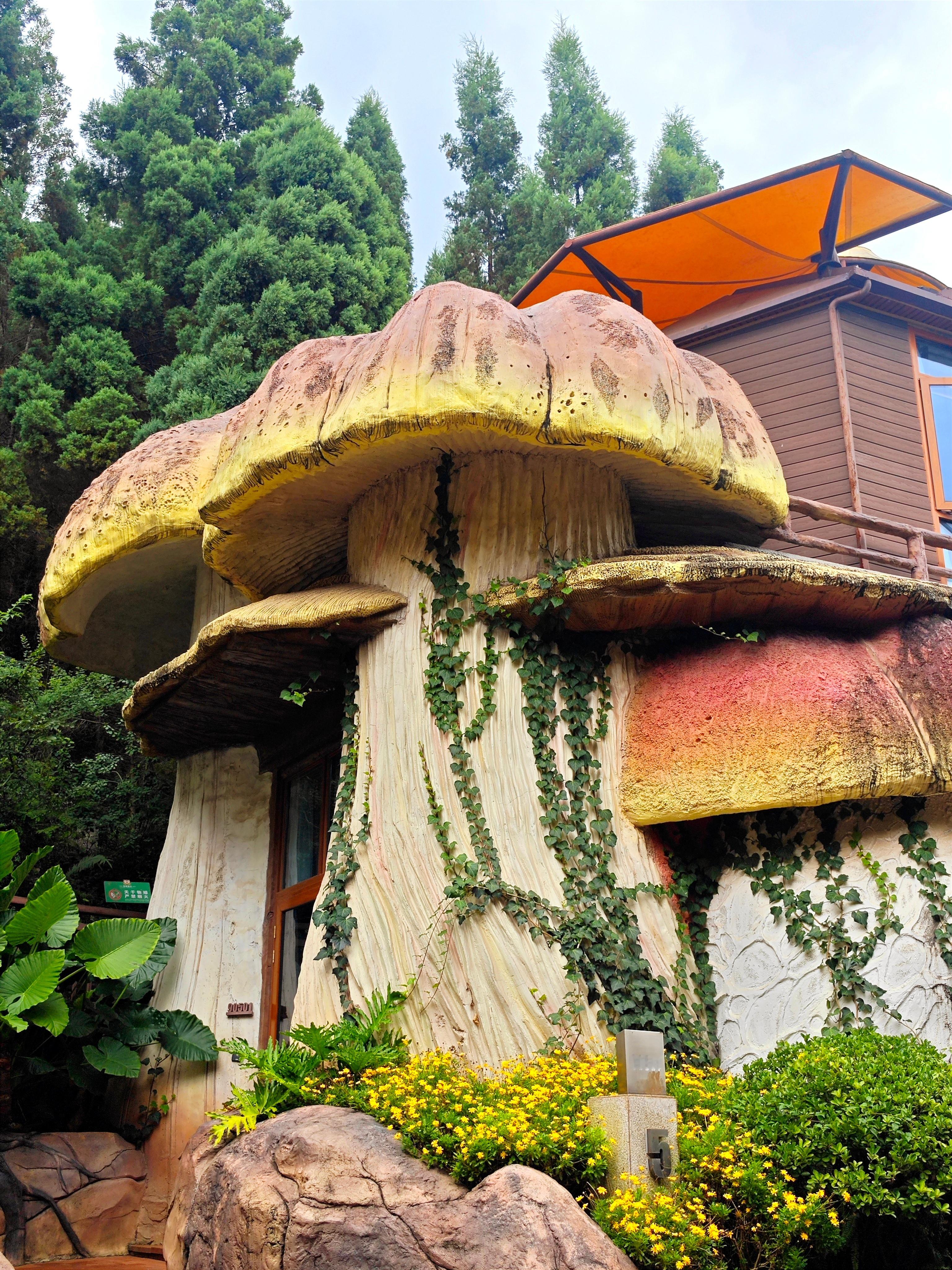 蘑菇野奢酒店的外观设计别具一格,灵感源于野生菌类,五彩斑斓的造型仿佛一朵朵真实的蘑菇在山间肆意生长,充满童趣和创意。