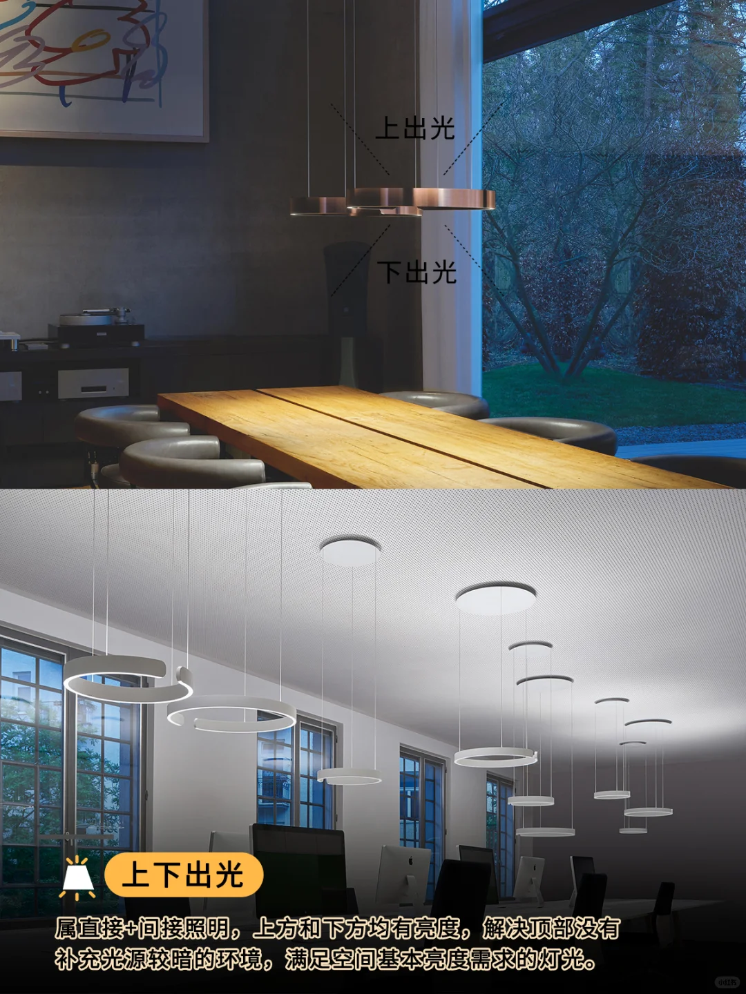 💡属直接+间接照明,上方和下方均有亮度,解决顶部没有补充光源较暗的环境,满足空间基本亮度需求的灯光。