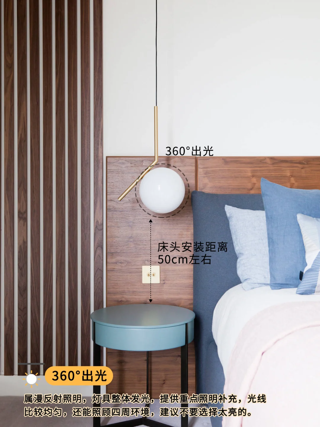 距离卧室床头距30-50cm, 客厅灯离地230cm左右