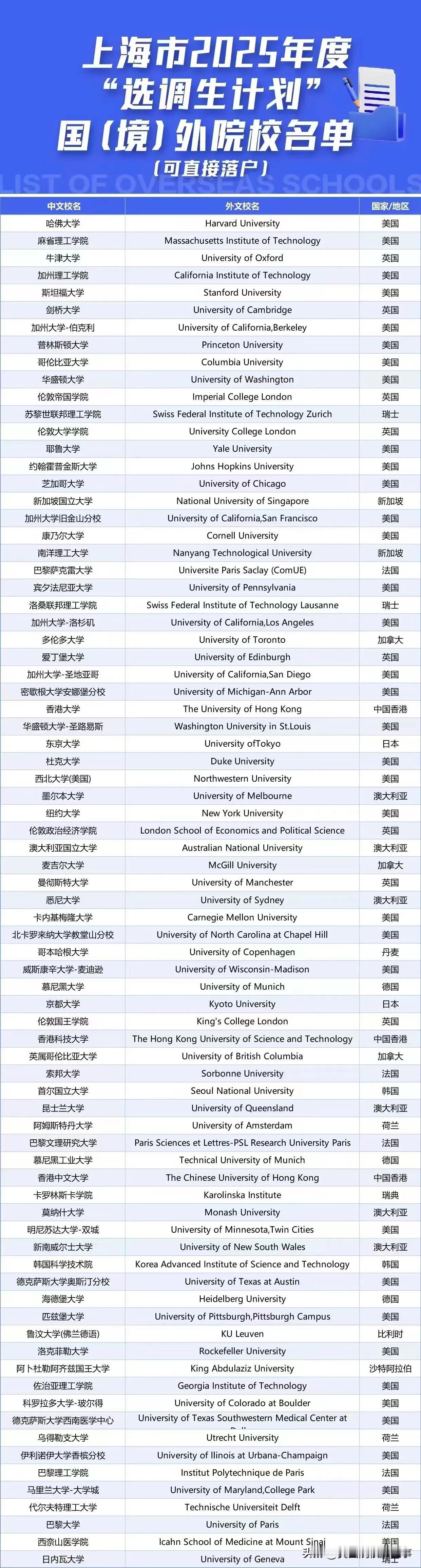 京沪公布「2025选调及优培计划国(境)外院校名单」👇