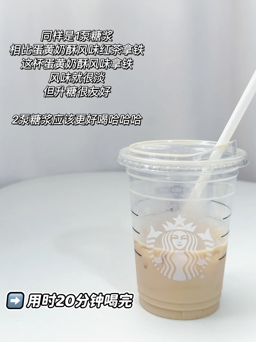 同样是1泵糖浆,相比蛋黄奶酥风味红茶拿铁,这杯蛋黄奶酥风味拿铁风味就很淡,但升糖很友好,2泵糖浆应该更好喝哈哈哈〰️