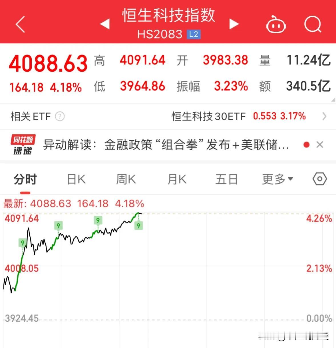 重磅利好消息恒生科技指数大涨超4%,基民如何解套赚钱还是要靠ETF基金:9月26日上午十二点看盘,今天恒生科技指数继续暴涨超4%,突破了4000点,我昨天抄底我588000份额的恒生科技ETF,寓意很好,“我发发”,今天果然赚大发了,收到国庆大红包。所以说,基民如何解套赚钱?还是要靠ETF基金,这是全村基民回本赚钱的希望了:有赚钱机会时进去重仓赚钱,随时买随时卖出收红包,还不收印花税,基民如果被套了拿着不动,过两天又跌回去了。所以还是用我说的高级玩法玩ETF,“长线看趋势,中线看波段,短线看节奏”,有行情一波赚钱解套回本。玩恒生科技和中概互联网基金的人点赞关注评论区留言,我会每天复盘预判恒生科技ETF的走势,观点仅供参考。
