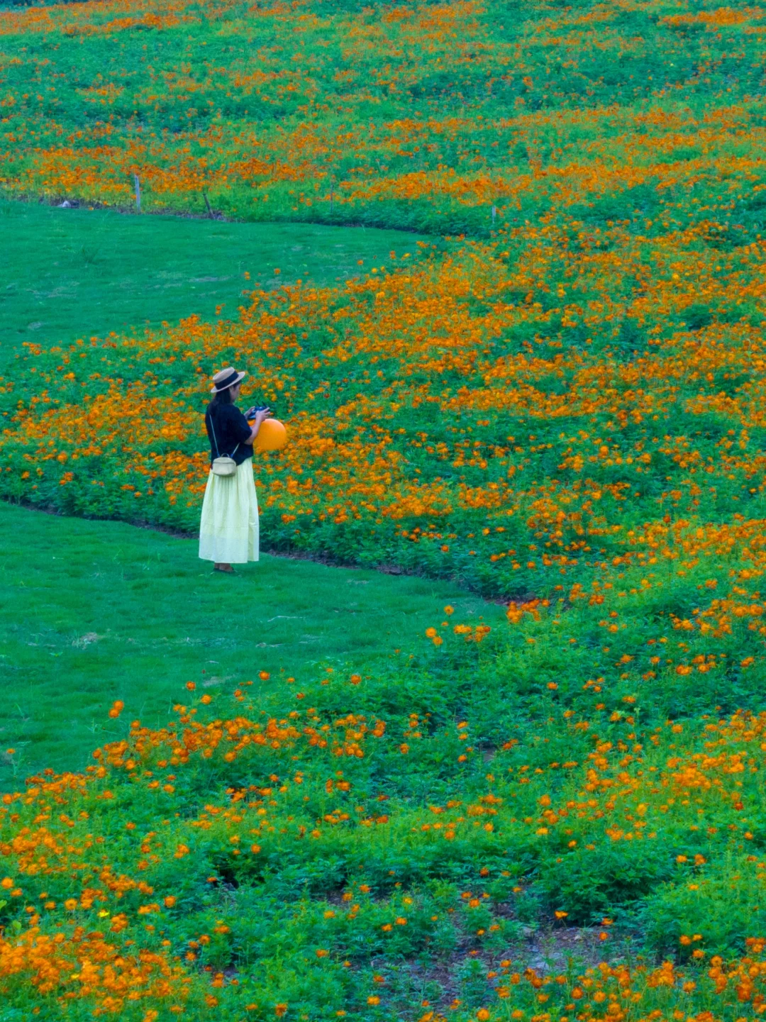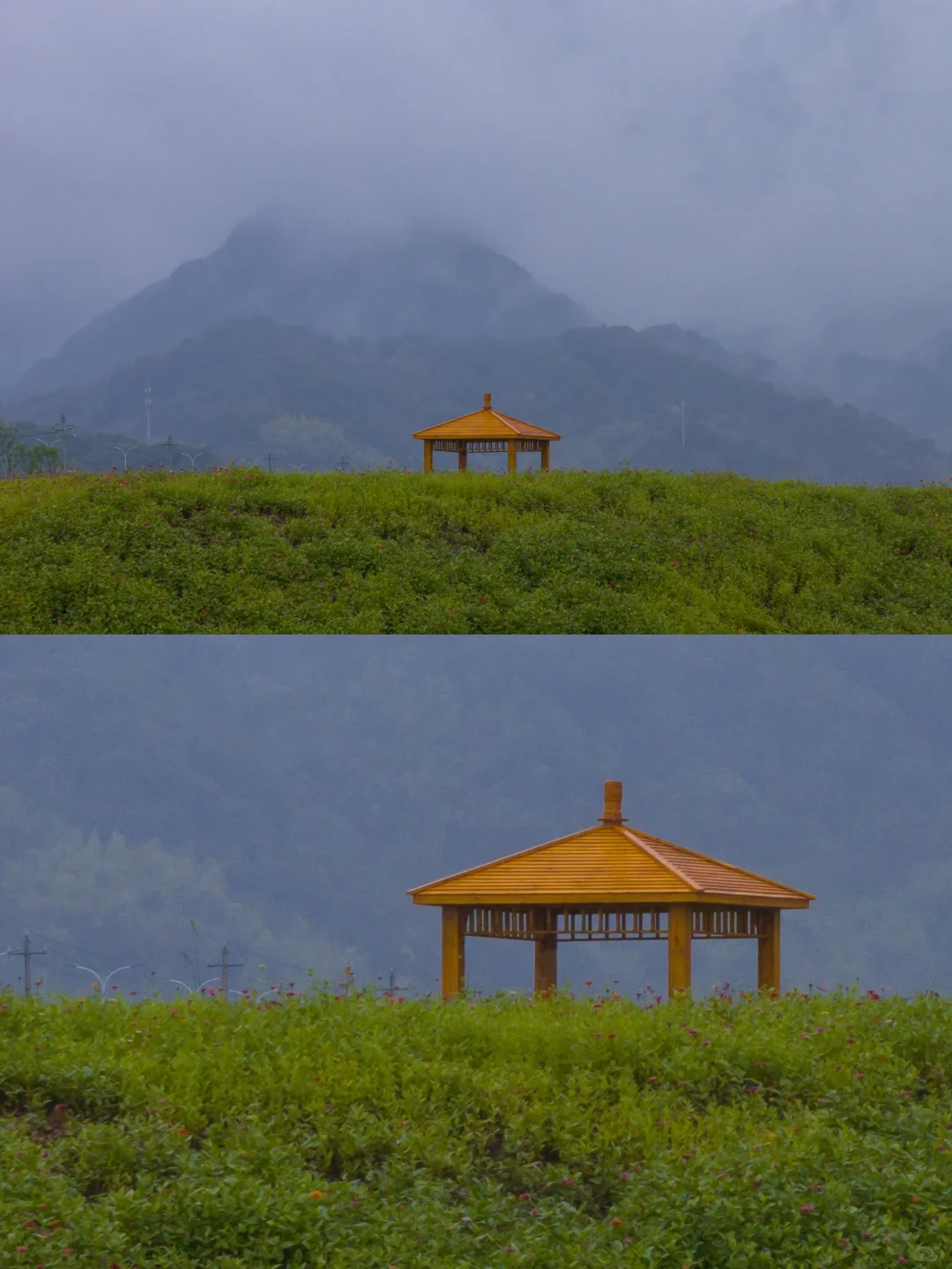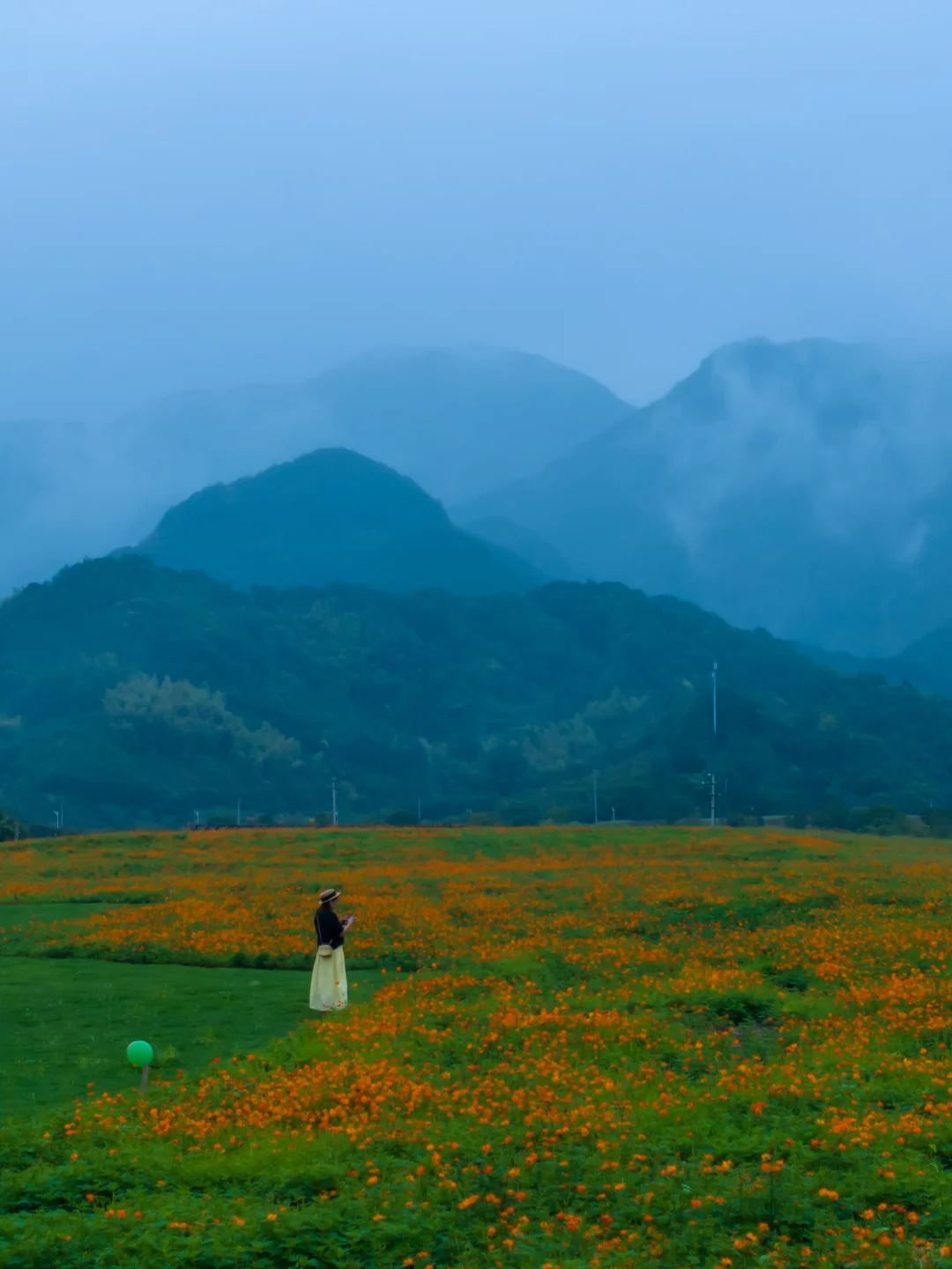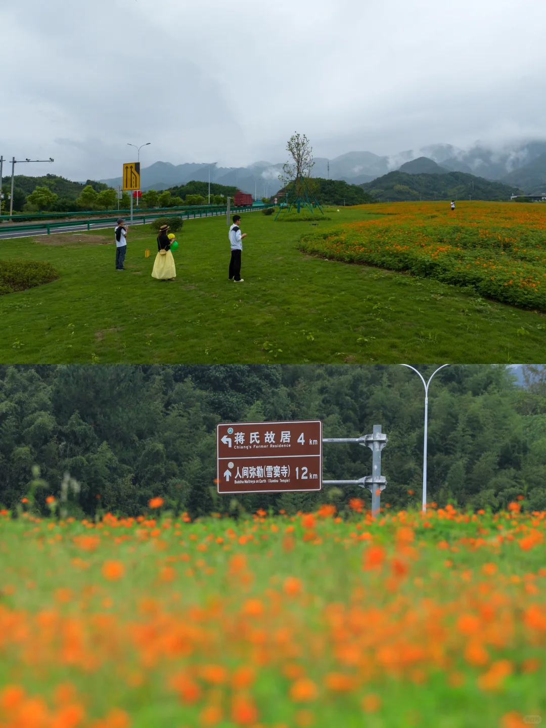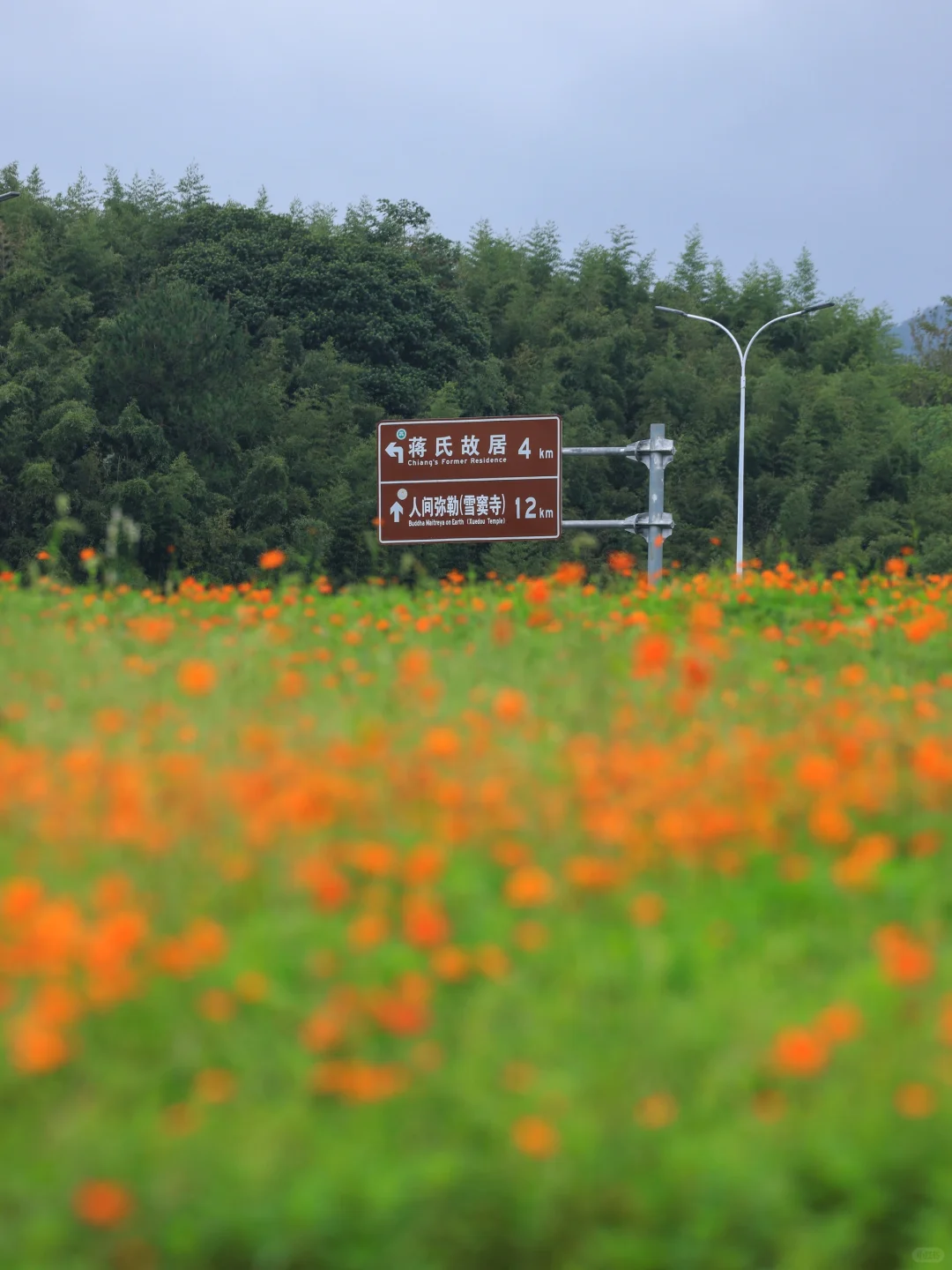 秋日烟雨江南的氛围感,山色空蒙雨亦奇 这一刻江南烟雨具像化了。 奉化云溪谷小区门口这片格桑花花海在秋天烟雨里绽放了