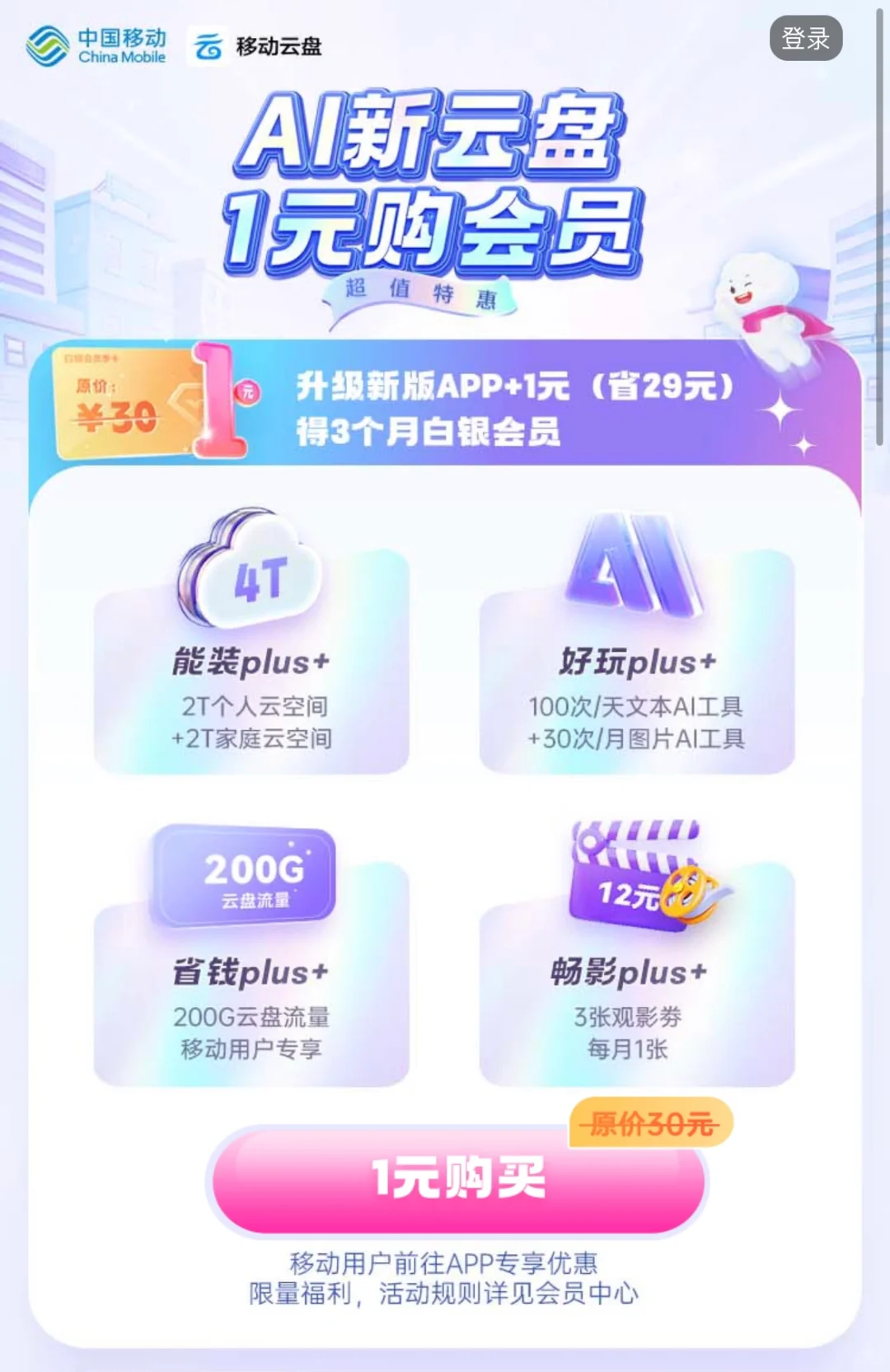 Hi 我是七七 短暂的放下生活的琐碎 短暂的逃离工作的烦恼 因为爱的人在身边,所以一起体验不一样的生活好像更有意思 出去旅游给女朋友拍照是正经事 作为摄影师的我最重要的就是给女朋友拍照记录旅行啦 手机拍摄的照片特别大,每次为了存照片,就要去清理内存! 还有每次看她想要发朋友圈,但要一张张研究拼图时真的头疼 这次出去旅游前做了攻略,找一款照片神器 就是中国移动云盘,它界面简单容易操作 它可以自动备份手机相册、通讯录、微信文件,而且都是免流量 摄影师在上传或下载文件时不会受到速度限制,这样可以节省时间,提高工作效率 里面还有女朋友最喜欢的一键生成朋友圈九宫格和AI动漫风功能 里面还有超多实用工具等我有空慢慢研究 现在移动云盘推出1元可以获得3个月白银会员的活动, 除了可以拥有4T超大空间,还有观影券!!等等福利 简直太棒了 移动云盘真的解决了我的存档焦虑啦 我把链接放在笔记下方了有兴趣的朋友去了解一下吧