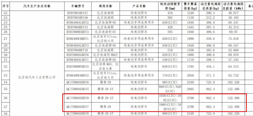 3.升级非常大的,腾势Z9和腾势Z9 GT。申报信息里,腾势给Z9和Z9 GT都配上了122.496kWh的大电池包,在腾势Z9上能交出的最高续航数字分别是1068公里和1036公里。如果是以比亚迪内部为角度进行对比,仰望U7在2025年年末的申报信息为纯电续航1006公里,但电池包则为150.01kWh。