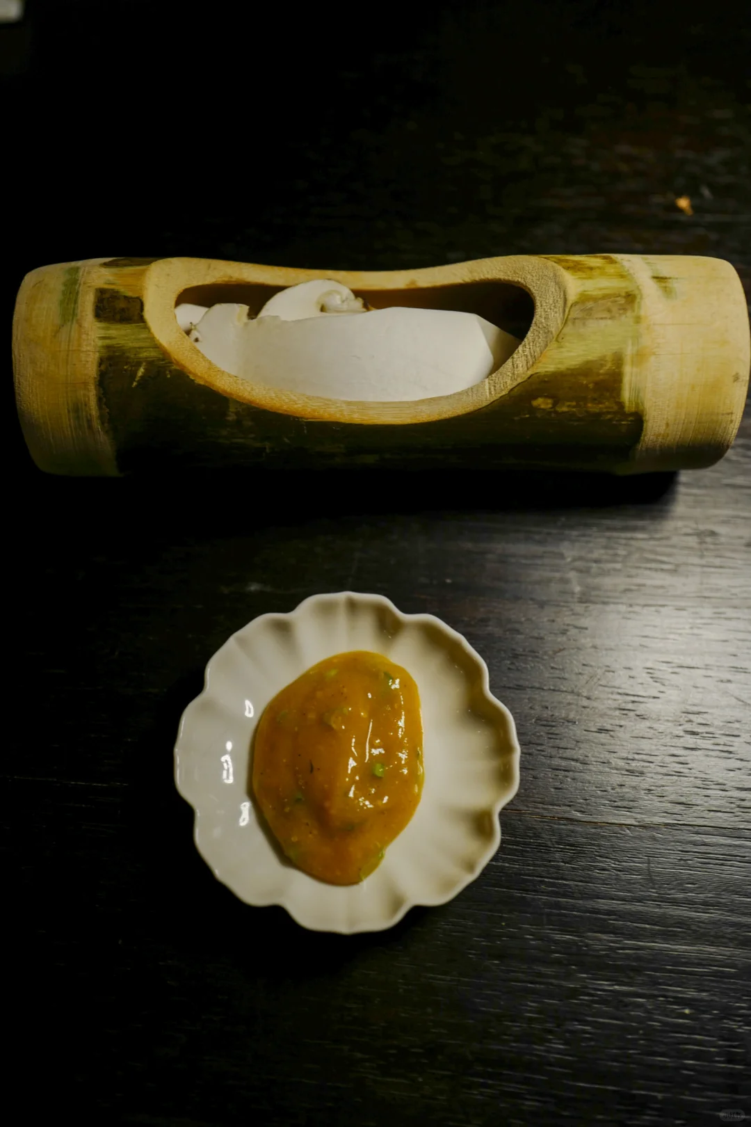 图六是松茸,竹筒蒸菌子,盖上大片新鲜松茸 ,菌子极鲜美,竹筒里有一些菌子露,用汤勺小心翼翼舀出来喝,人间值得。旁边配的是版纳常见的一种酱 里面放了大香菜碎,单吃或配菌子吃都很好。