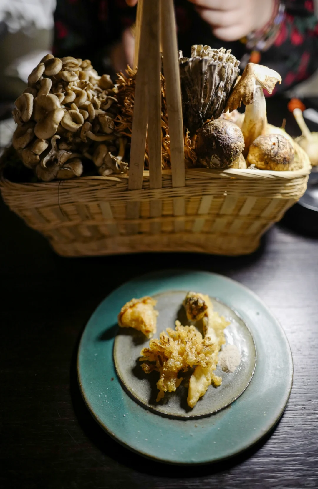 图七鸡油菌,是用天妇罗的做法来炸几种菌子,沾点海盐吃就很香。