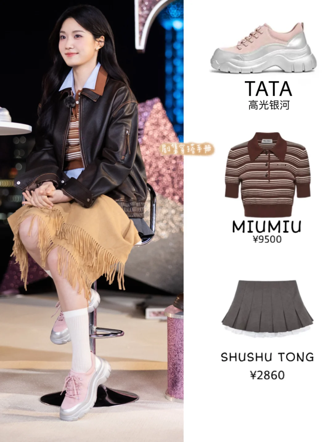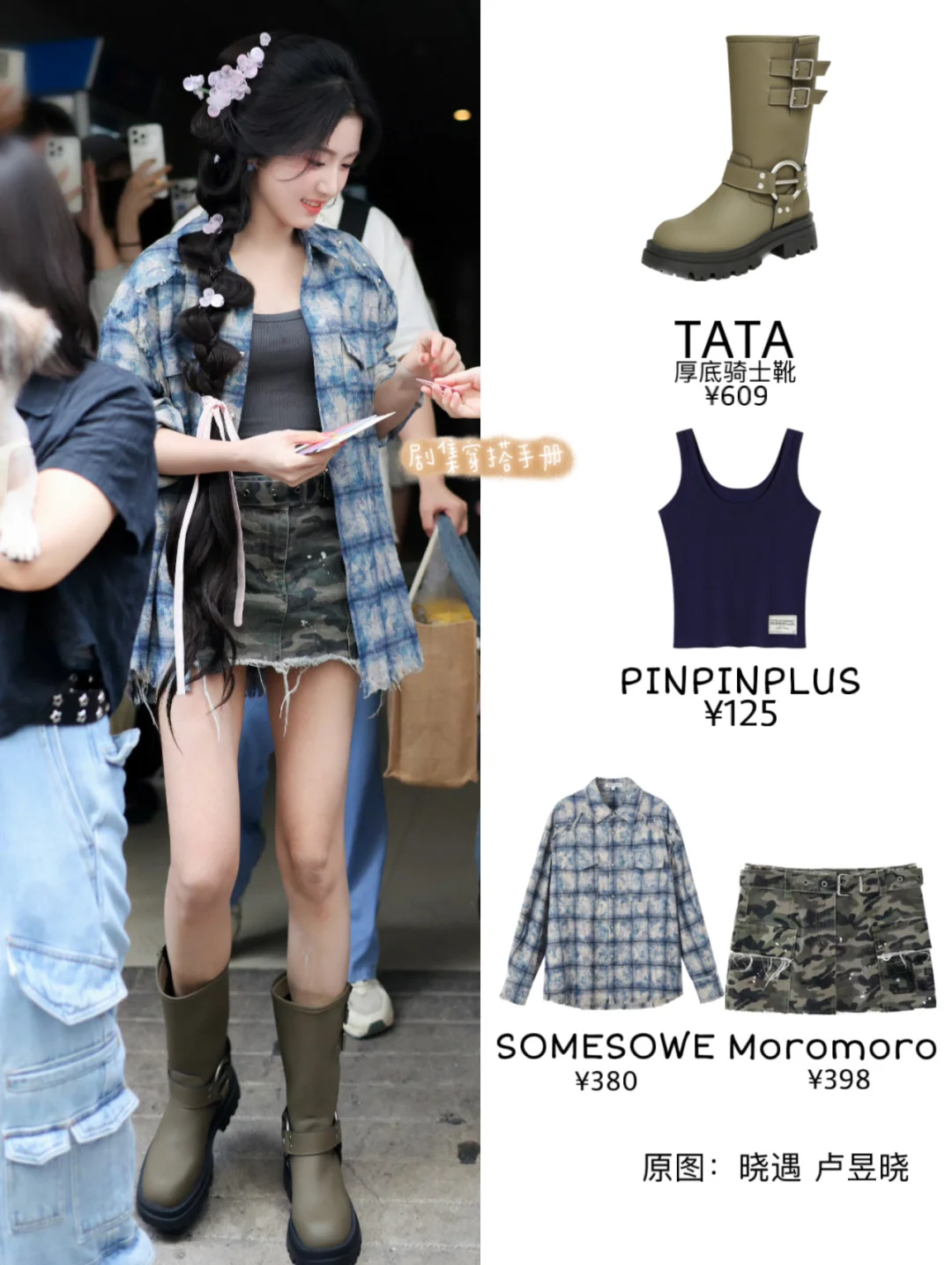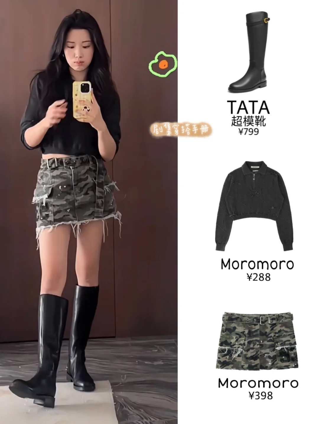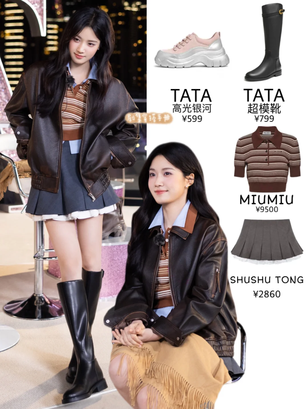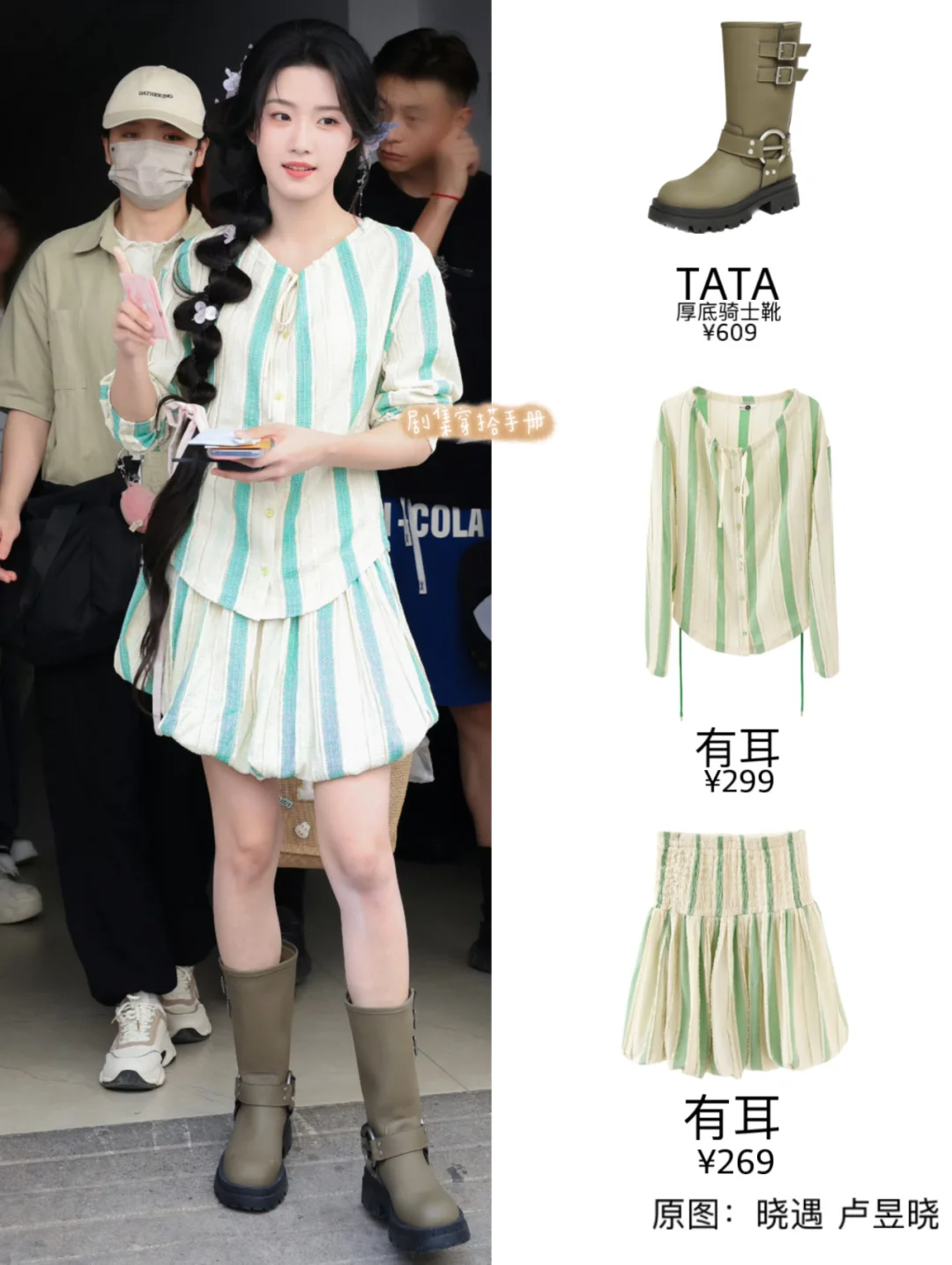 ✨卢昱晓同款穿搭来啦,噜噜很适合学院风穿搭,拼色针织衫搭配百褶裙,元气满满,俏皮可爱。 ✨卢昱晓还穿了几双很适合秋日借鉴的靴子,有Cici项偞婧等超模都在穿的TATA超模靴,长筒的款式搭配上锁扣设计,耐看又修饰腿型,很百搭。绿色的骑士靴配色就更加亮眼,配上同色系套装,太可爱