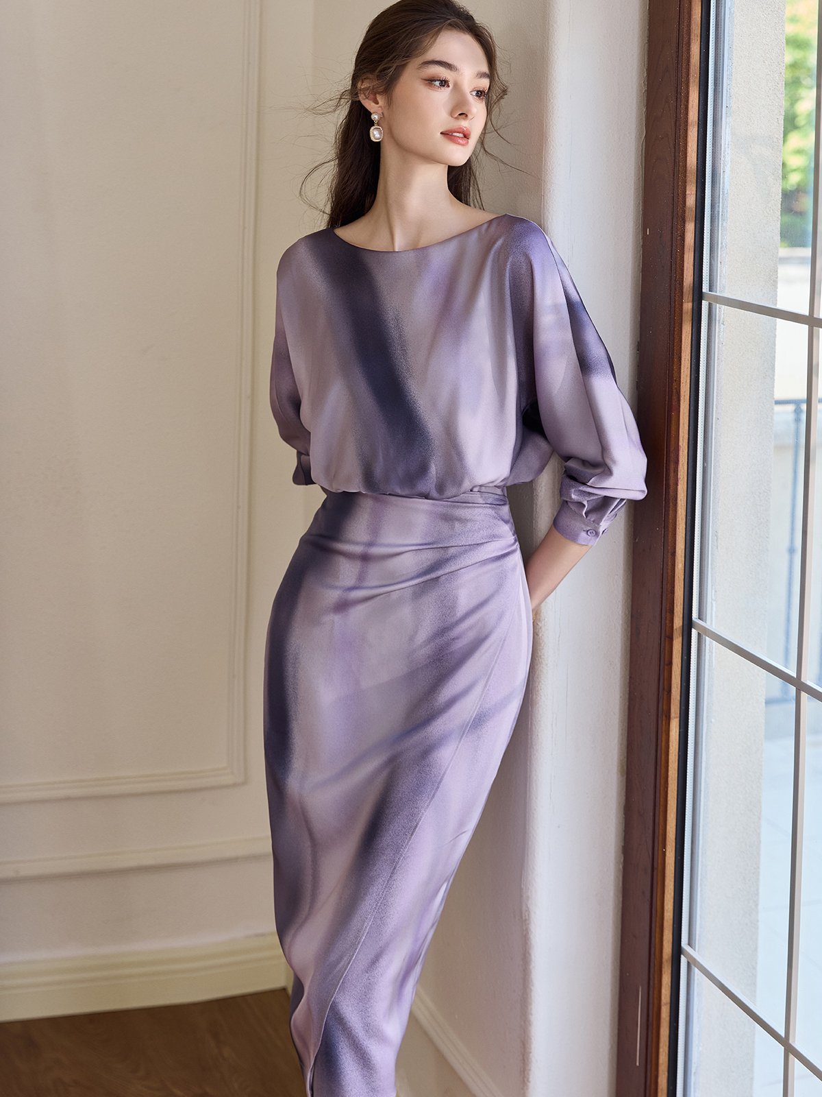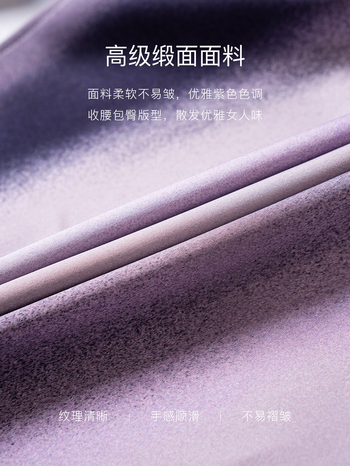 优雅紫色缎面系带连衣裙,设计精致,集优雅与时尚于一身,让30-34周岁的女性在这个季节里尽显气质与魅力。面料触感顺滑,轻盈舒适。一字领与H型廓形设计,加上蝙蝠袖和中腰系带的细节,让整条裙子更显高贵与典雅。拉链设计方便穿脱,包臀裙型与中长款设计更是突显身材曲线。紫色晕染图案的点缀,给人一种高贵又不失温柔的感觉。这款连衣裙让女性在这个季节变得更加迷人,她们喜欢这条裙子,也喜欢这个季节。