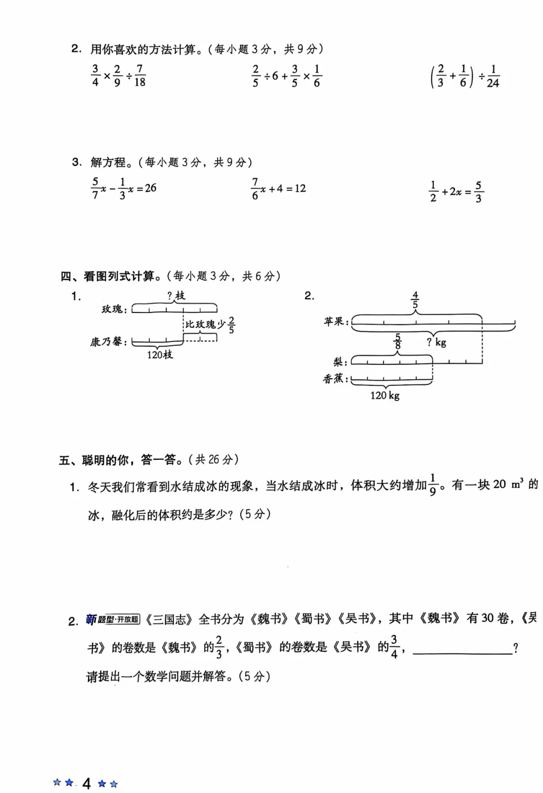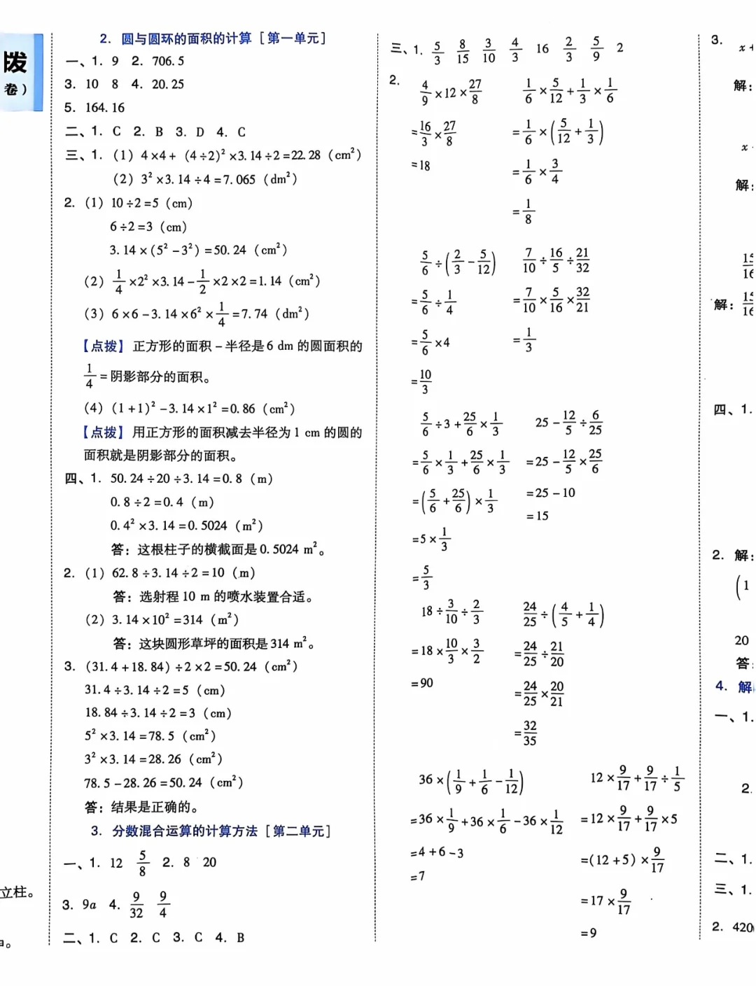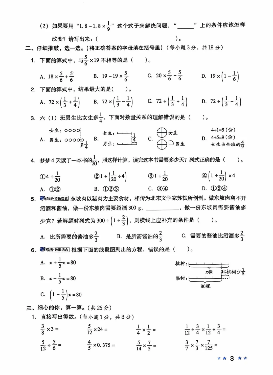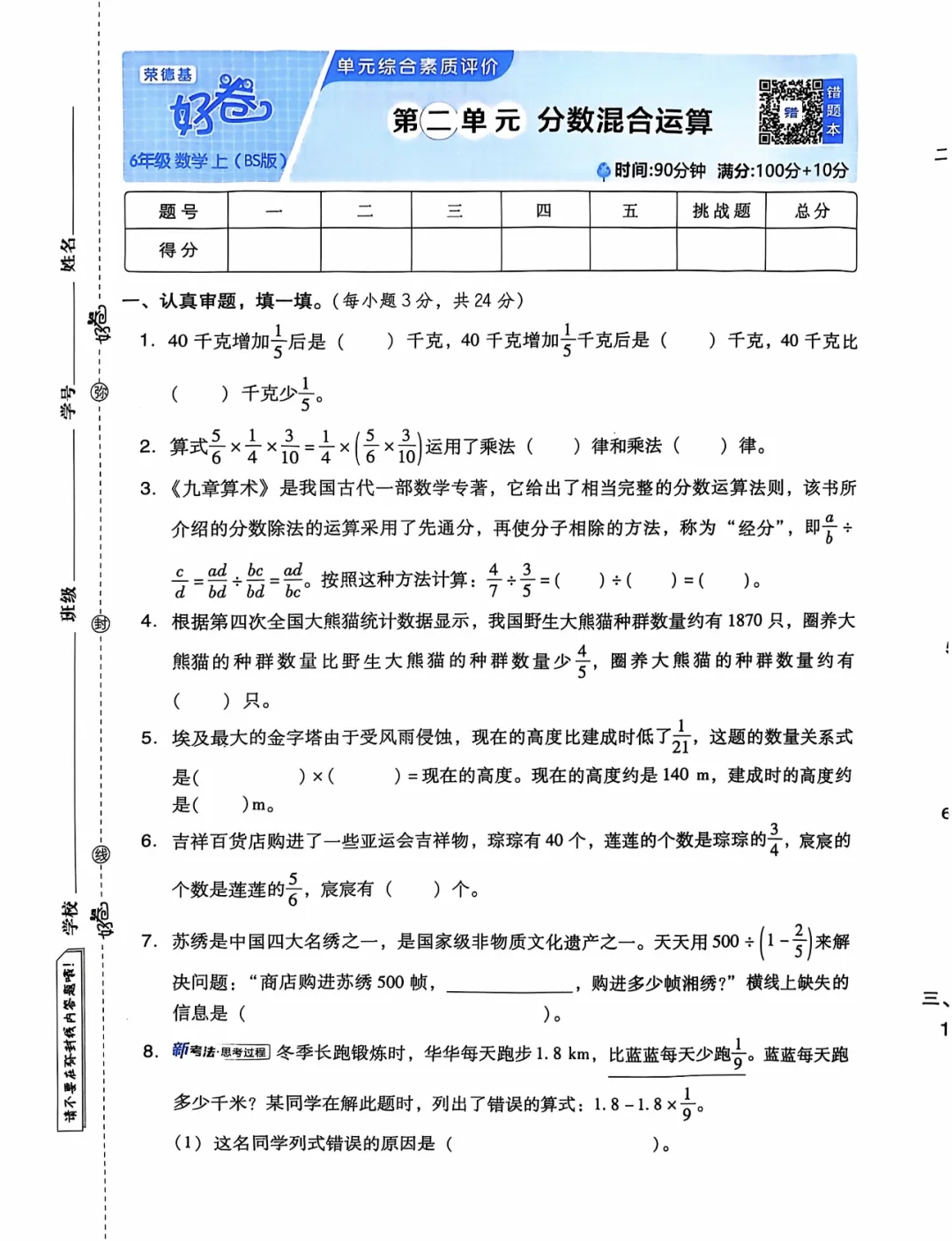 周末分享六年级上册北师版第二单元《分数混合运算》测试卷
