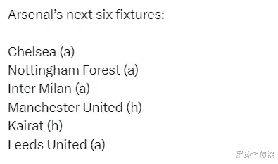 阿森纳未来6场比赛:客战切尔西、客战诺丁汉森林、客战国米、主战曼联、主战凯拉特、客战利兹联。