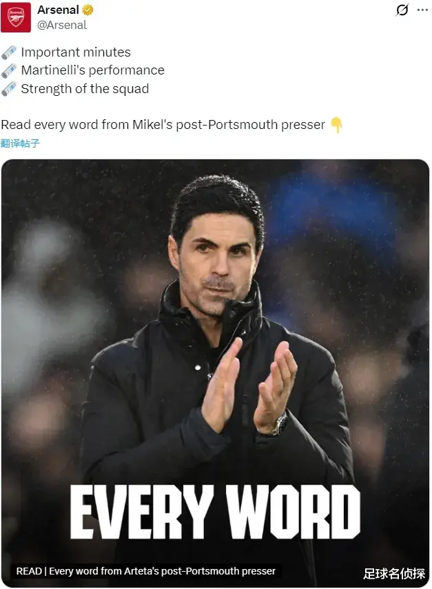阿尔特塔出席了赛后新闻发布会,我们来看看阿森纳主帅的发言。