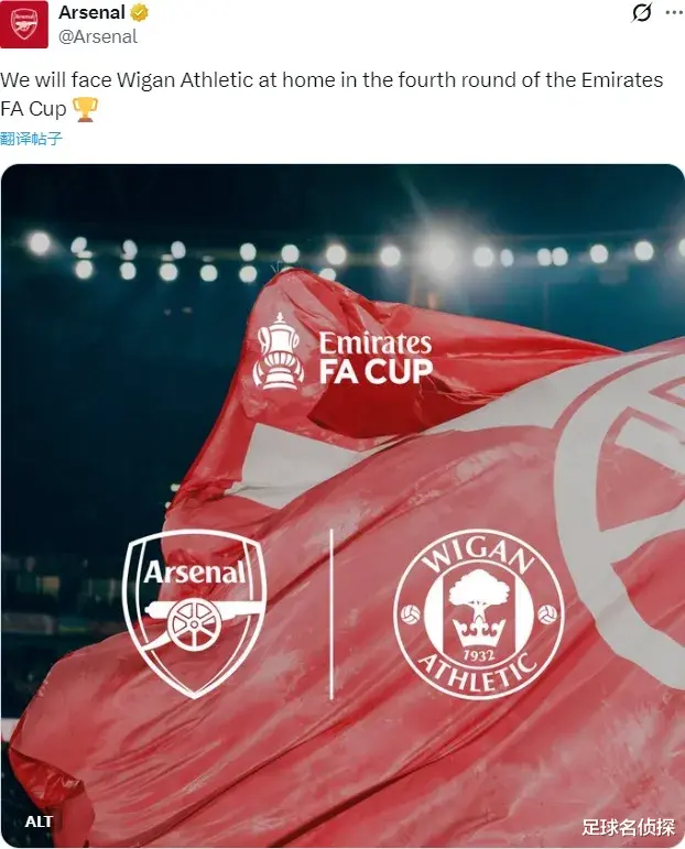 官方:阿森纳将在足总杯第四轮主场对阵维冈竞技。