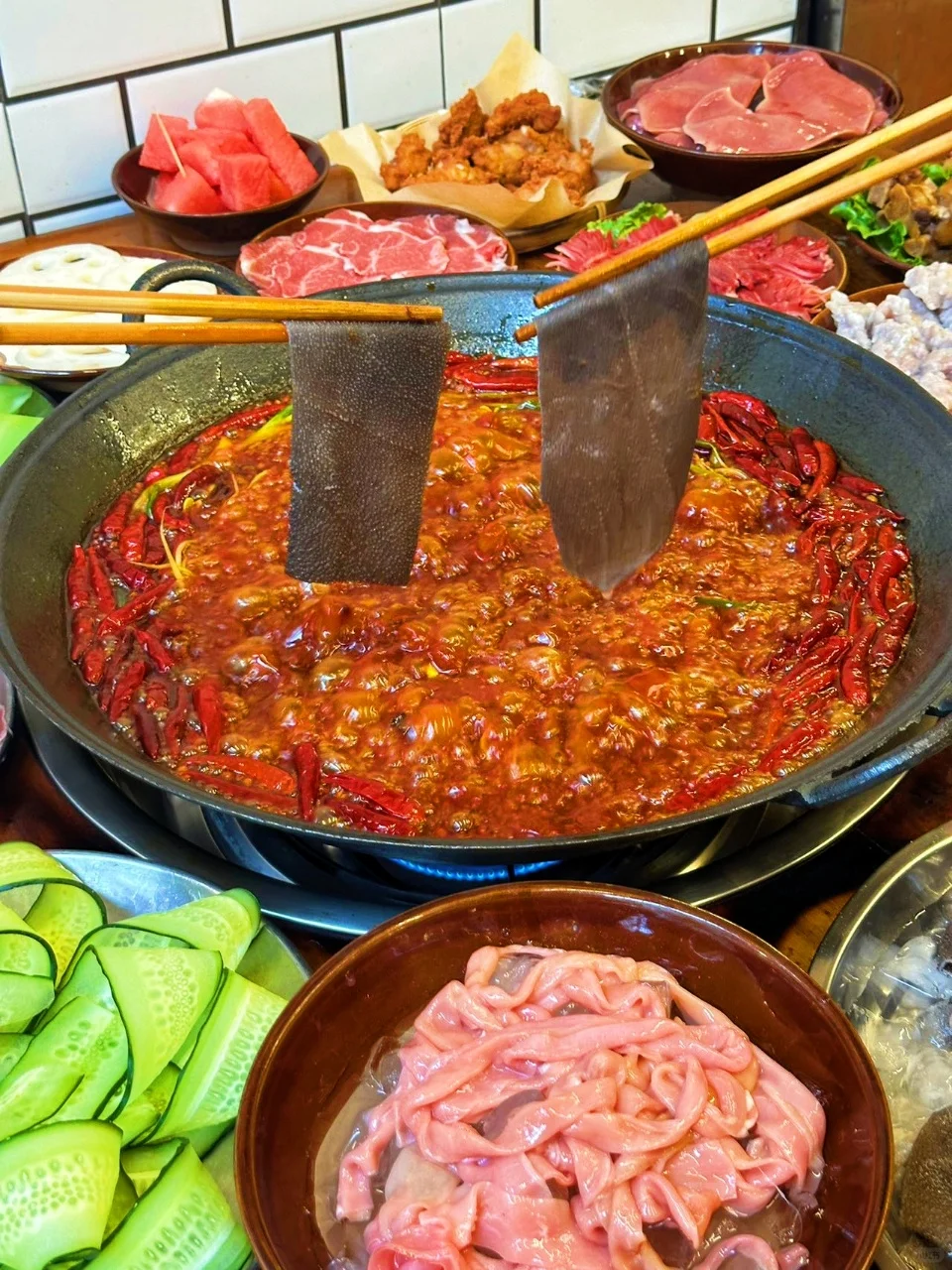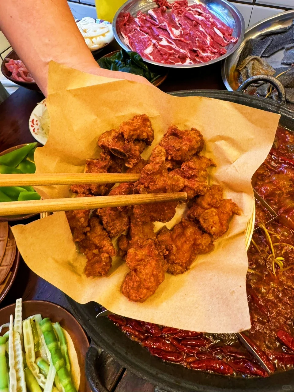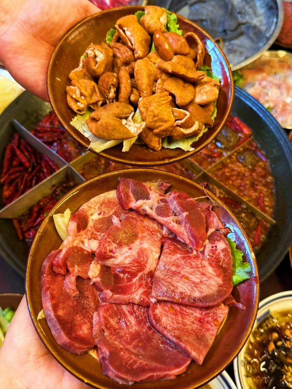 🥘我们排了一个半小时的队才吃到,但为了这美味,等待完全值得。😜火锅底料纯手工炒制,那香味,闻着就超诱人。😍