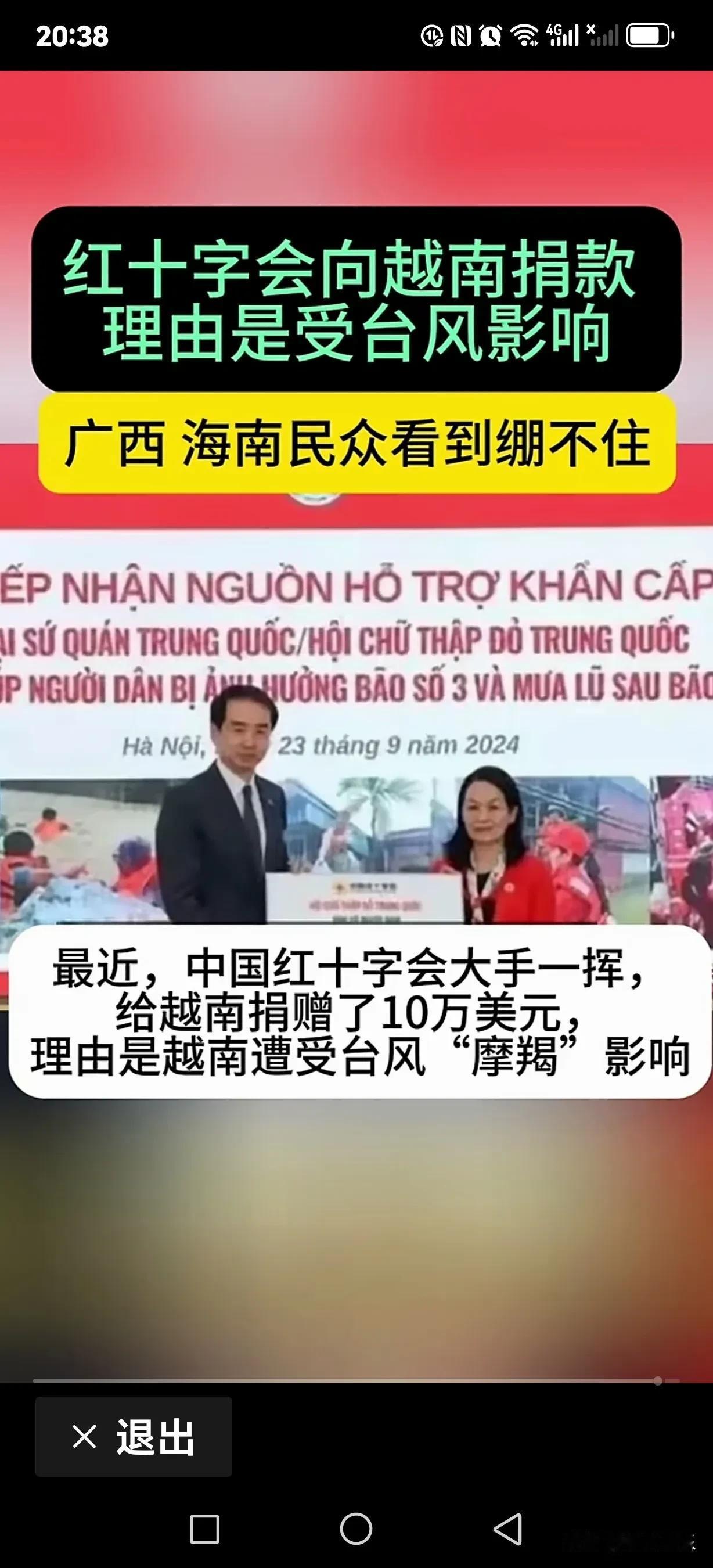 红十字会向越南捐款,理由是受台风影响! 真的很不理解,拿大家捐的款去帮助国外的,我们的国家还有很多穷人为什么不捐? 还是韩红说的让人佩服,韩红说她不会拿钱捐给国外,因为我们的国家还有很多穷人,她每次看到这些穷人她都觉得很难过。 所以,真正做好事的,要经得起老百姓的监督。像红十字会捐款给国外的,他们经过国人同意了吗?这些款项都是大家捐的,为什么他们擅作主张捐出去了? 真的很搞不明白,大家觉得呢?