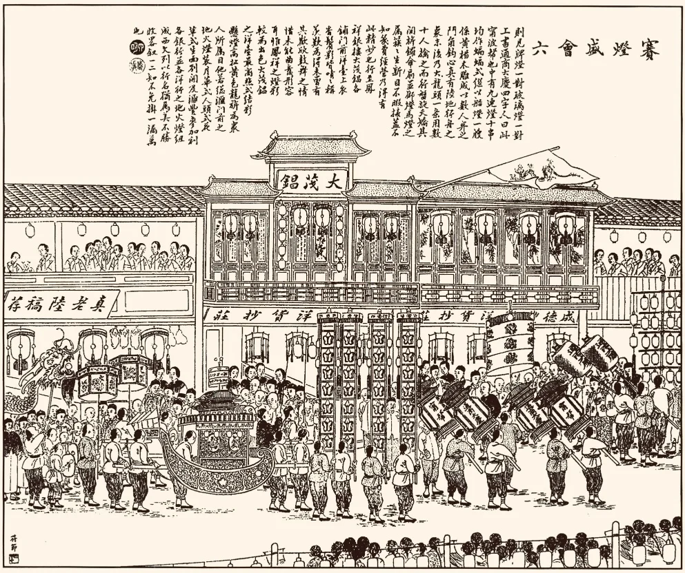第四起为丝业公所。前导为起码牌灯二对,有“四海永清”字样,锣灯一对,随后有灯伞十六顶,每伞四顶,即间以聚宝盆灯、六角亭灯、龙船灯、蝴蝶灯等类,内有清客细乐一班,共二十余人,均在乐器上悬挂小灯一盏。