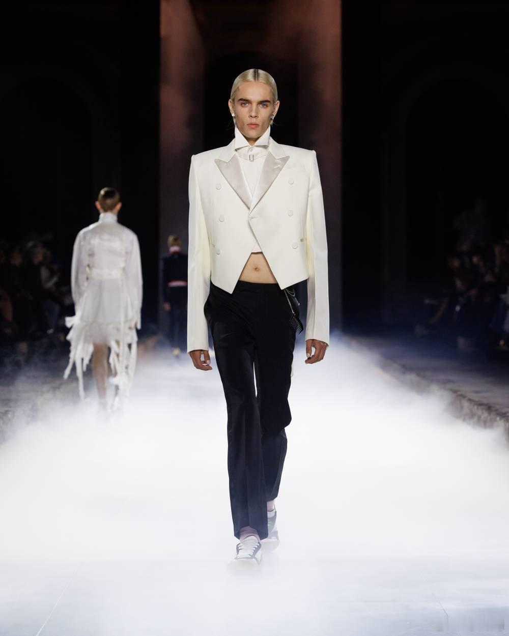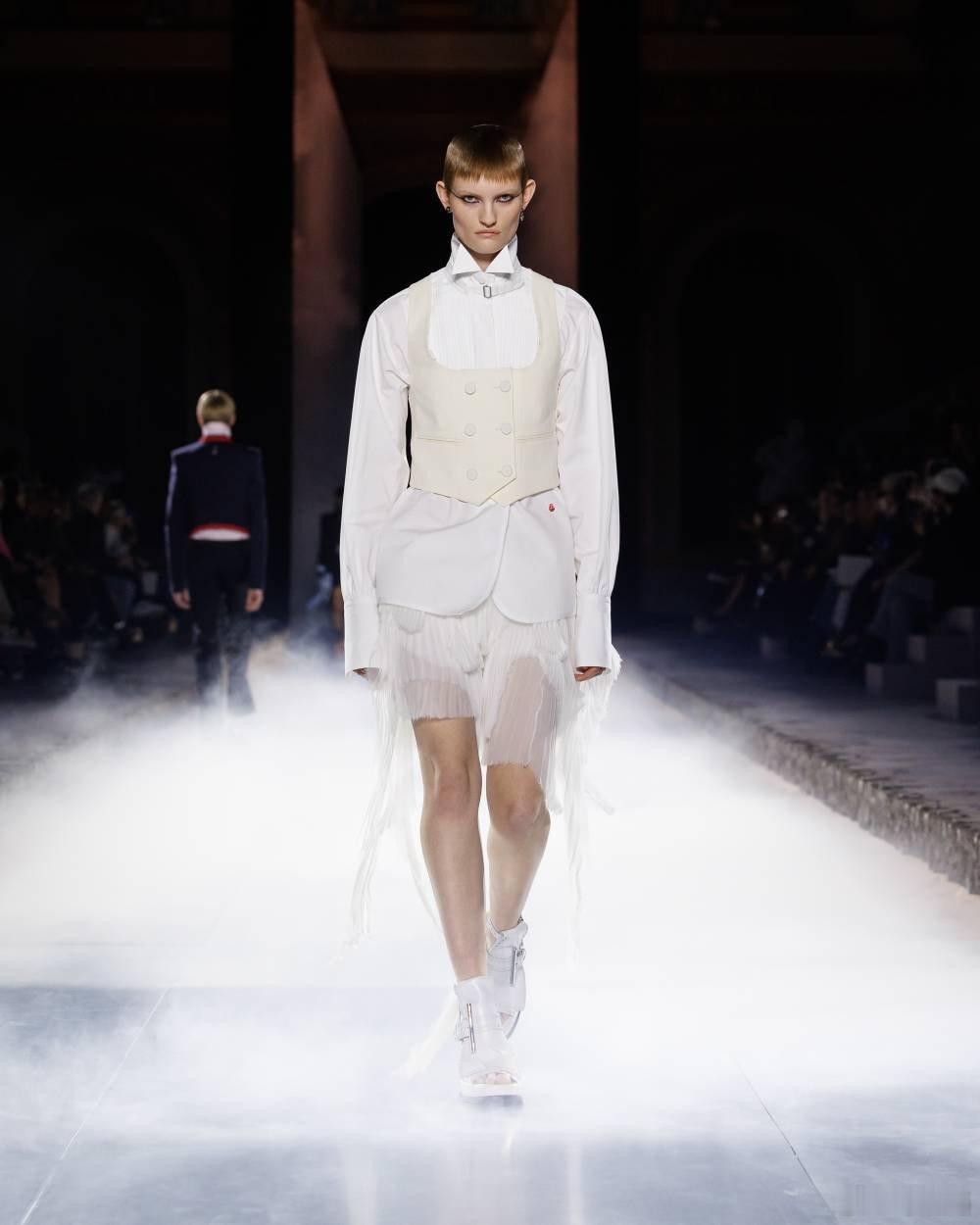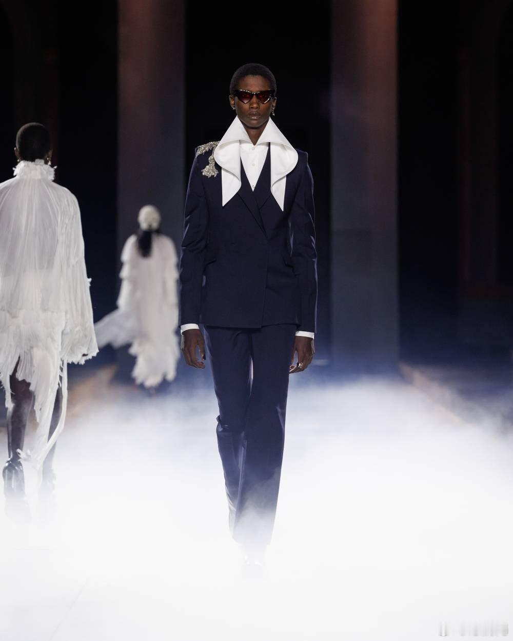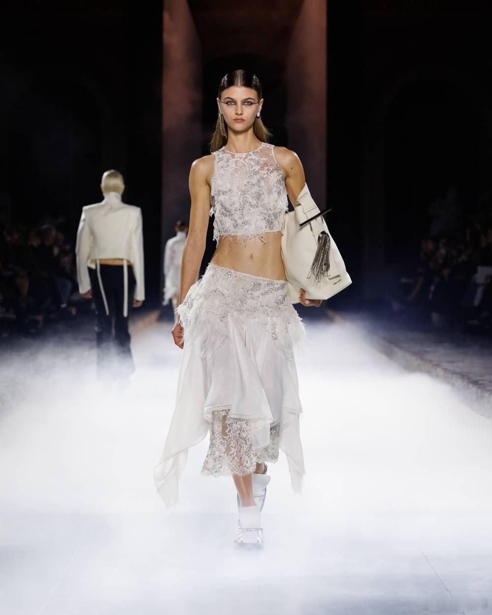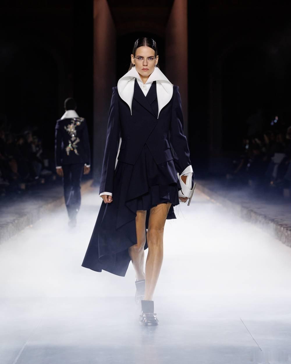 #重塑麦昆工艺美学#手工处理的丝绸,细腻的质感与美丽的配色,让人爱不释手。“班西女妖” 刺绣丝绸,手绘的艺术形象充满魅力。巴黎美术学院的宏伟秀场,为大秀提供了绝佳的背景。