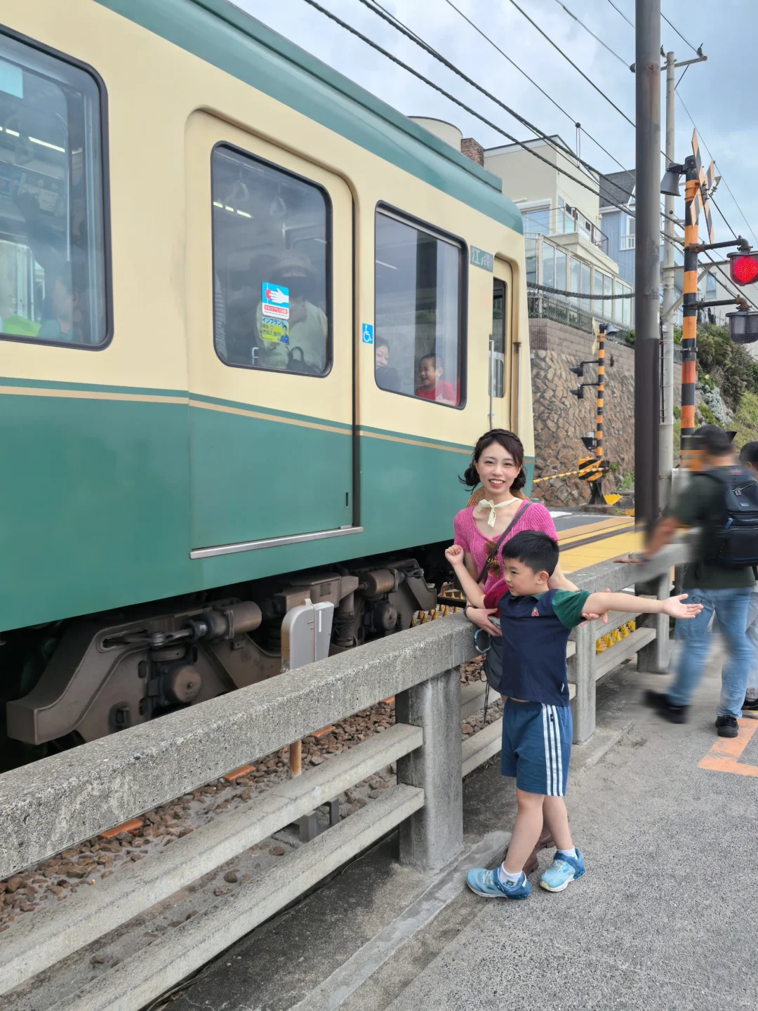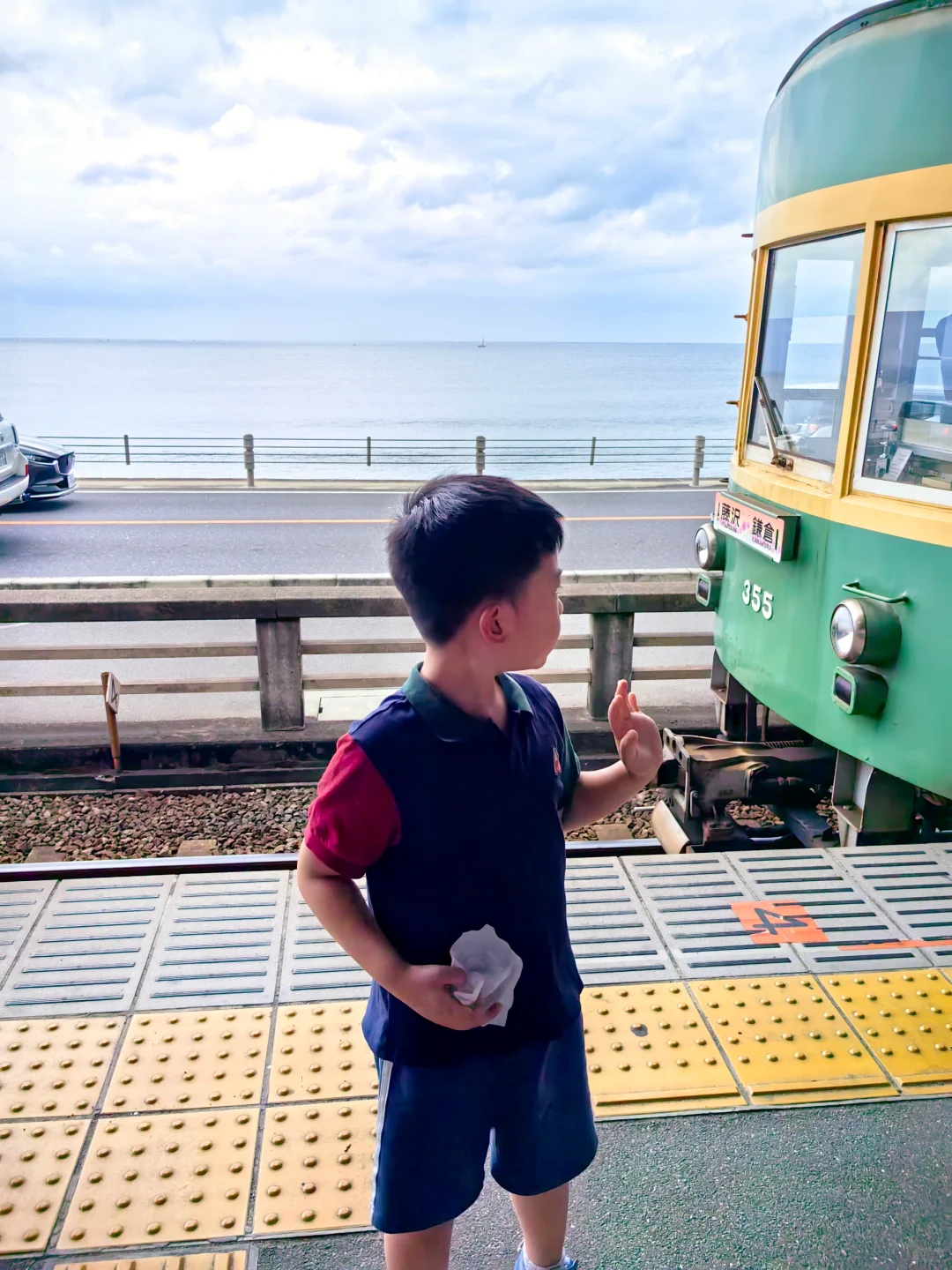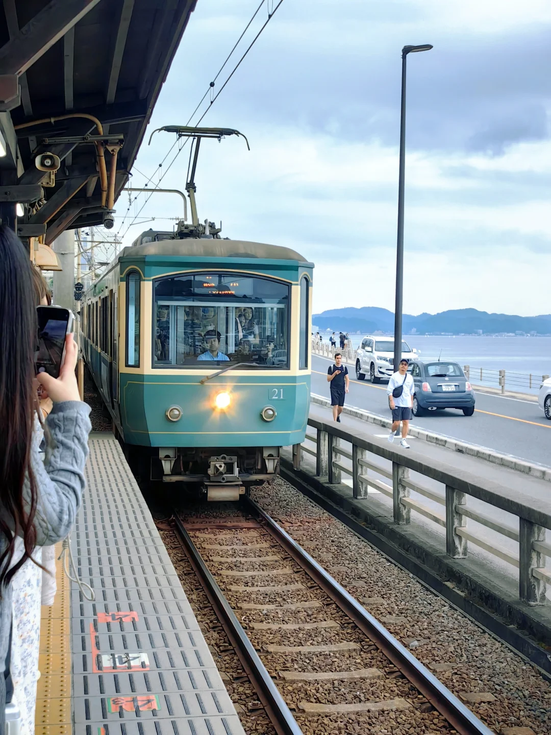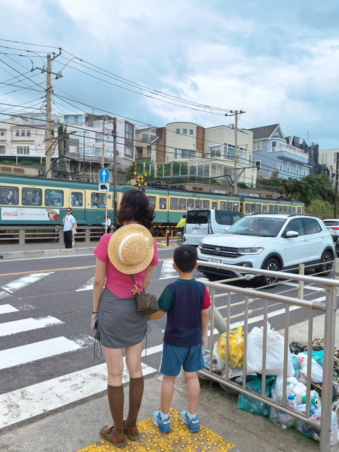 去过像镰仓的站,这次终于到达。 江之電驶过,《灌篮高手》BGM随之而来的扑面感觉。不管天气如何,前往的列车塞得满满的。 木质地板列车搭配江户时期建筑,穿过狭窄街道,在海边驶过。 🚆游玩可以在“镰仓高校前站”下来。 在列车两旁拍照的人多,蹲列车驶过。车内的拍,车外的也拍。拍的是大家的青春吧。 🍀如果时间充沛,可以下海滩走走。小朋友看到海滩就挪不动了,后面撑着伞也继续挖了会。 蹲个夕阳☀海边列车,氛围感拉满。 🩵🩵🩵