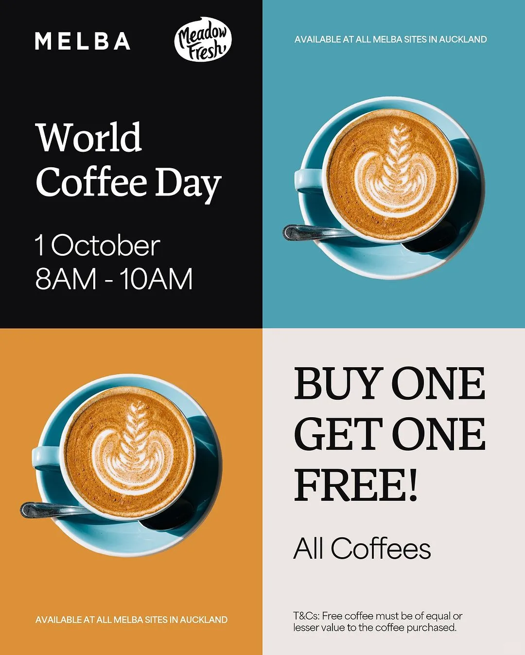 [向右R]还有Melba咖啡也有庆祝世界咖啡日活动,10月1日(周二)上午8点至10点为所有MELBA门店推出了一项特别优惠——咖啡买一送一!仅于2024年10月1日上午8点至10点,在奥克兰所有MELBA站点提供~