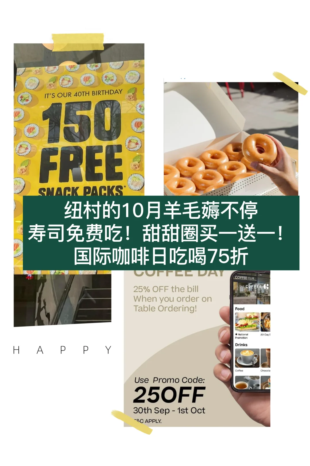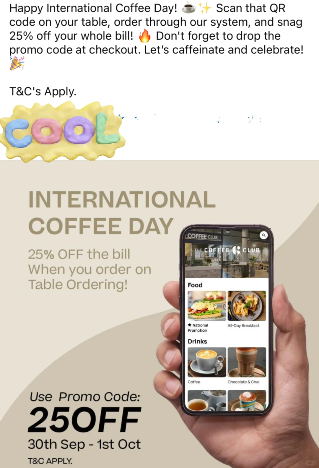 [向右R]The coffee club 国际咖啡日.,享受75折优惠!扫描桌子上的二维码,通过系统点餐,结账时输入优惠码 25 off就可以享受优惠啦~活动时间9.30-10.1