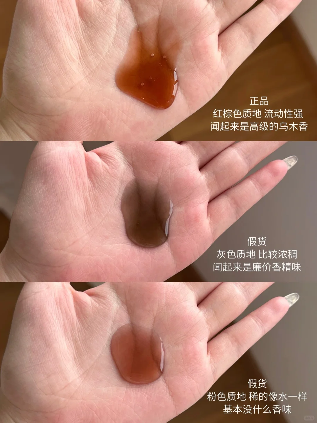 正品质地是红棕色,流动性强,而且是高级的乌木香;假货要么发灰要么颜色很浅,味道也很劣质,离谱一点的直接就是没味道