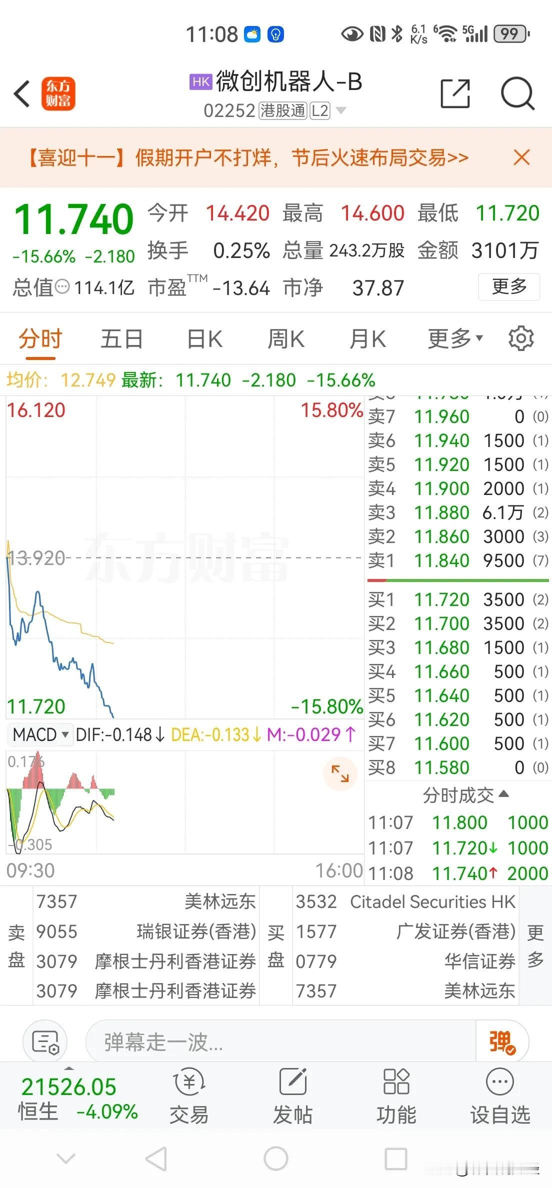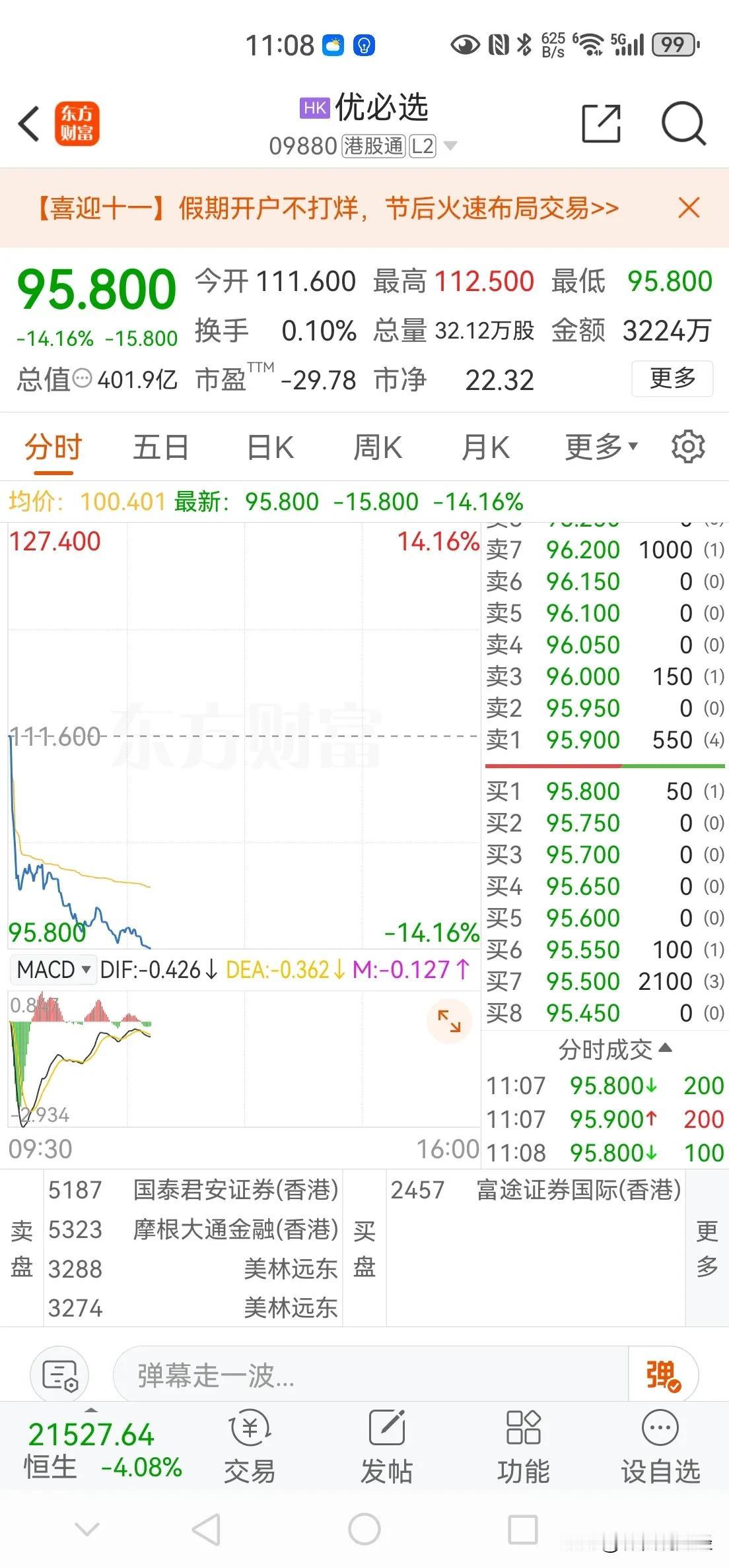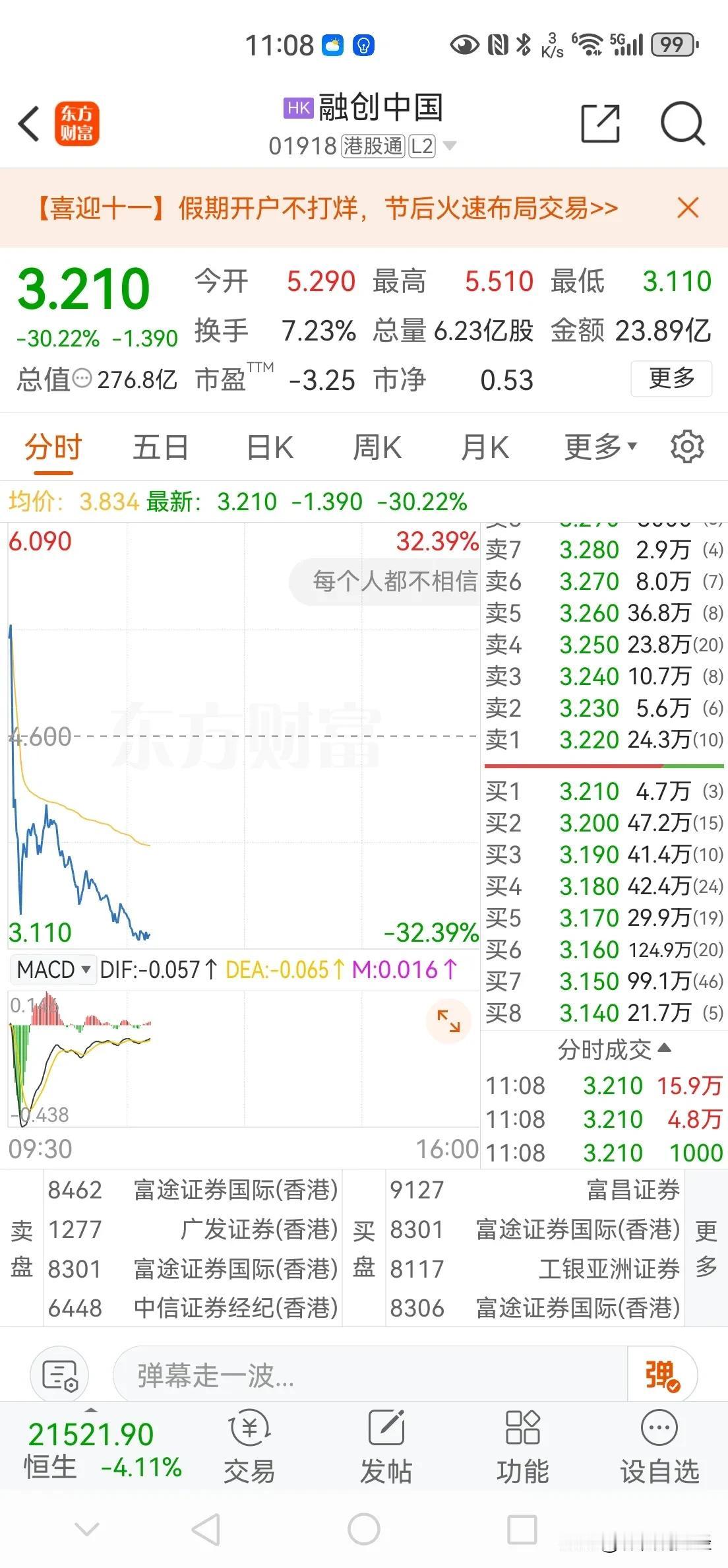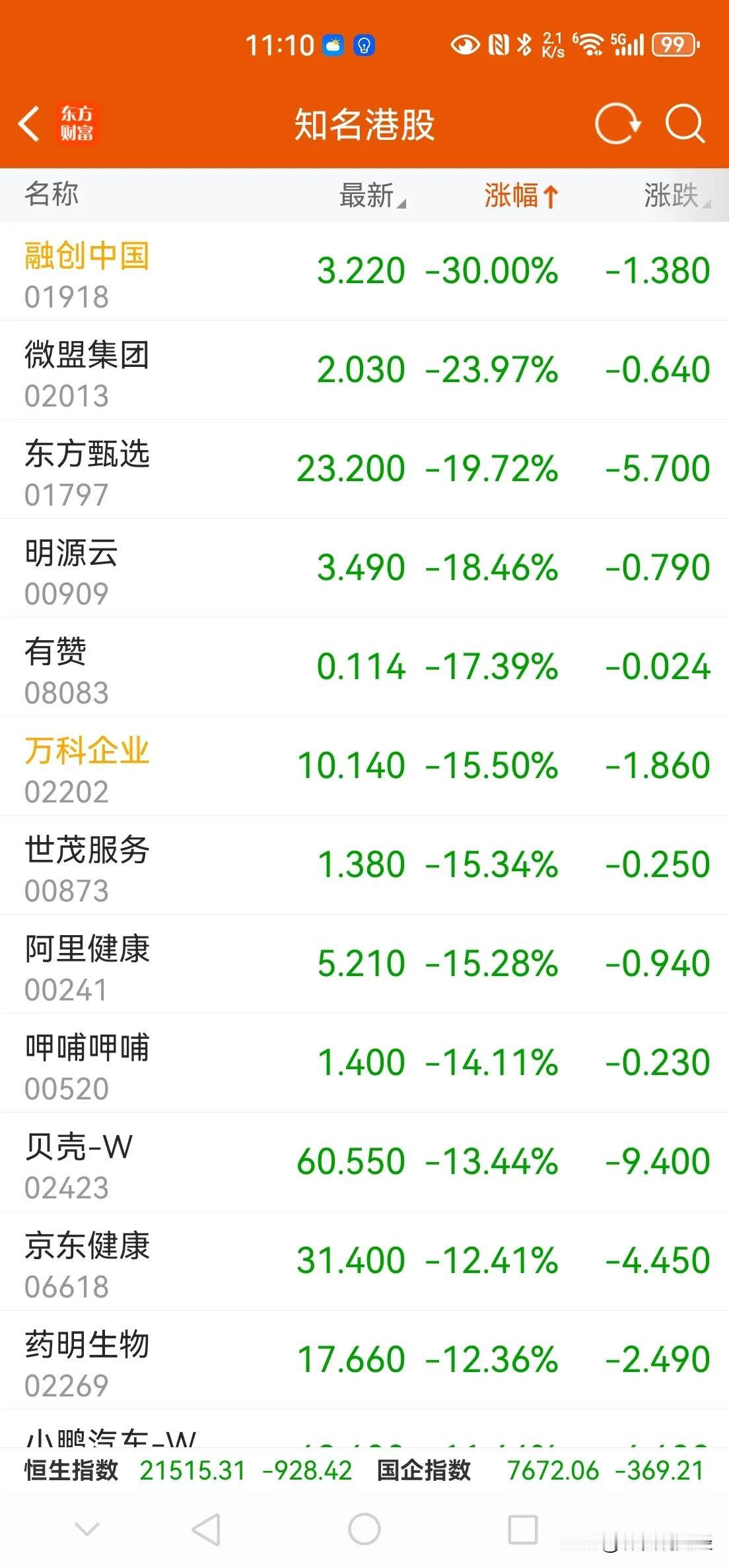 #港股# 港股大幅动荡!.恒生指数下跌4%,恒生科技指数下跌7%,融创中国开盘大