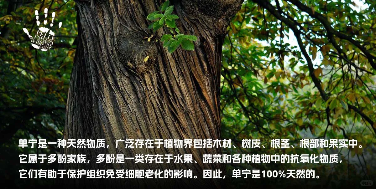 植鞣皮革中的单宁是一种天然的植物提取物,对于传统皮革制作过程至关重要。这种自然来源的化合物不仅赋予皮革独特的耐用性和美观的色泽,还保持了皮革的天然植物香气,使其成为一种高质量和可持续的材料选择。