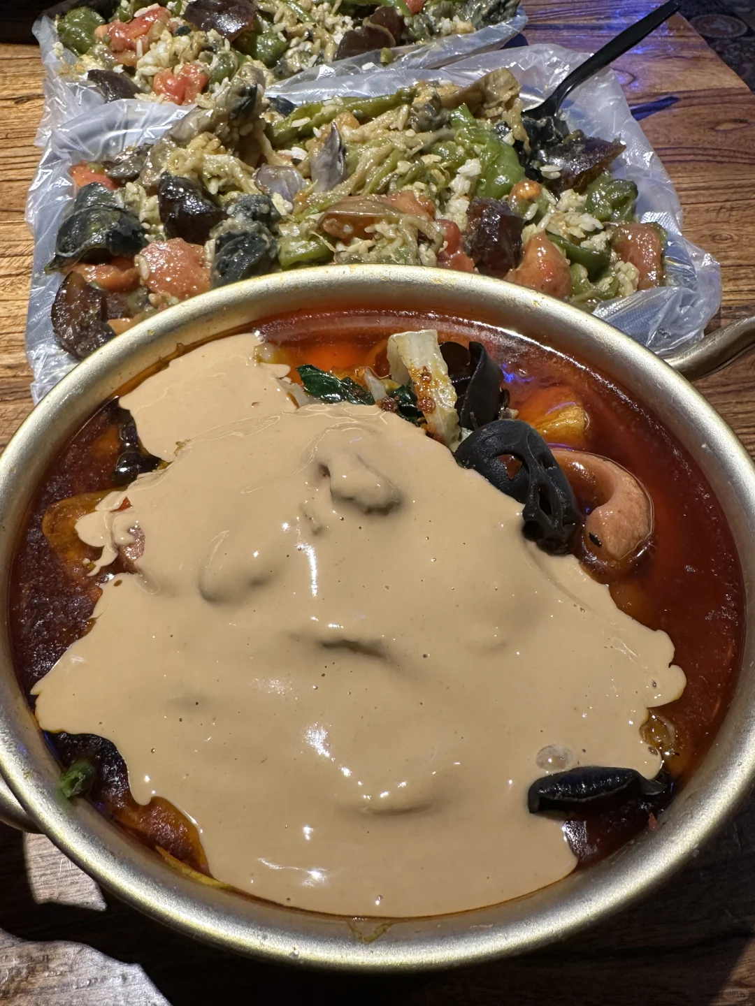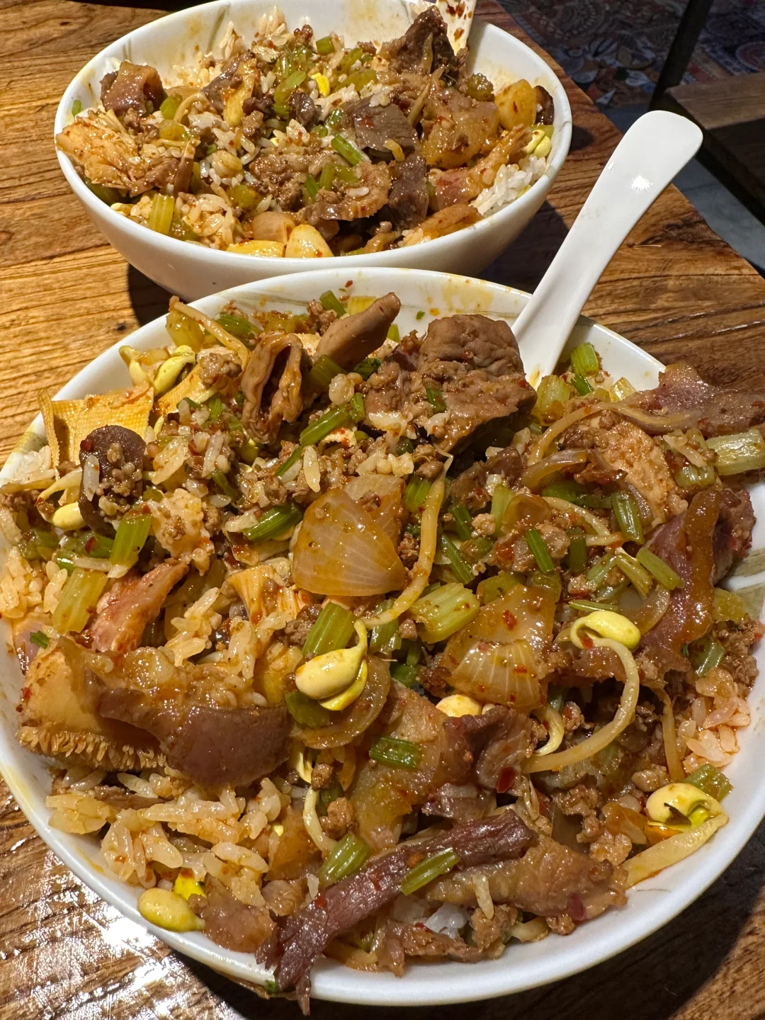 烧椒茄子皮蛋拌米饭、烤墨鱼嘴、渣渣牛杂锅拌饭、酸菜白肉 都很香!尤其是烧焦茄子皮蛋拌饭 这种腻腻乎乎的饭我还能再来十碗!![哇R]