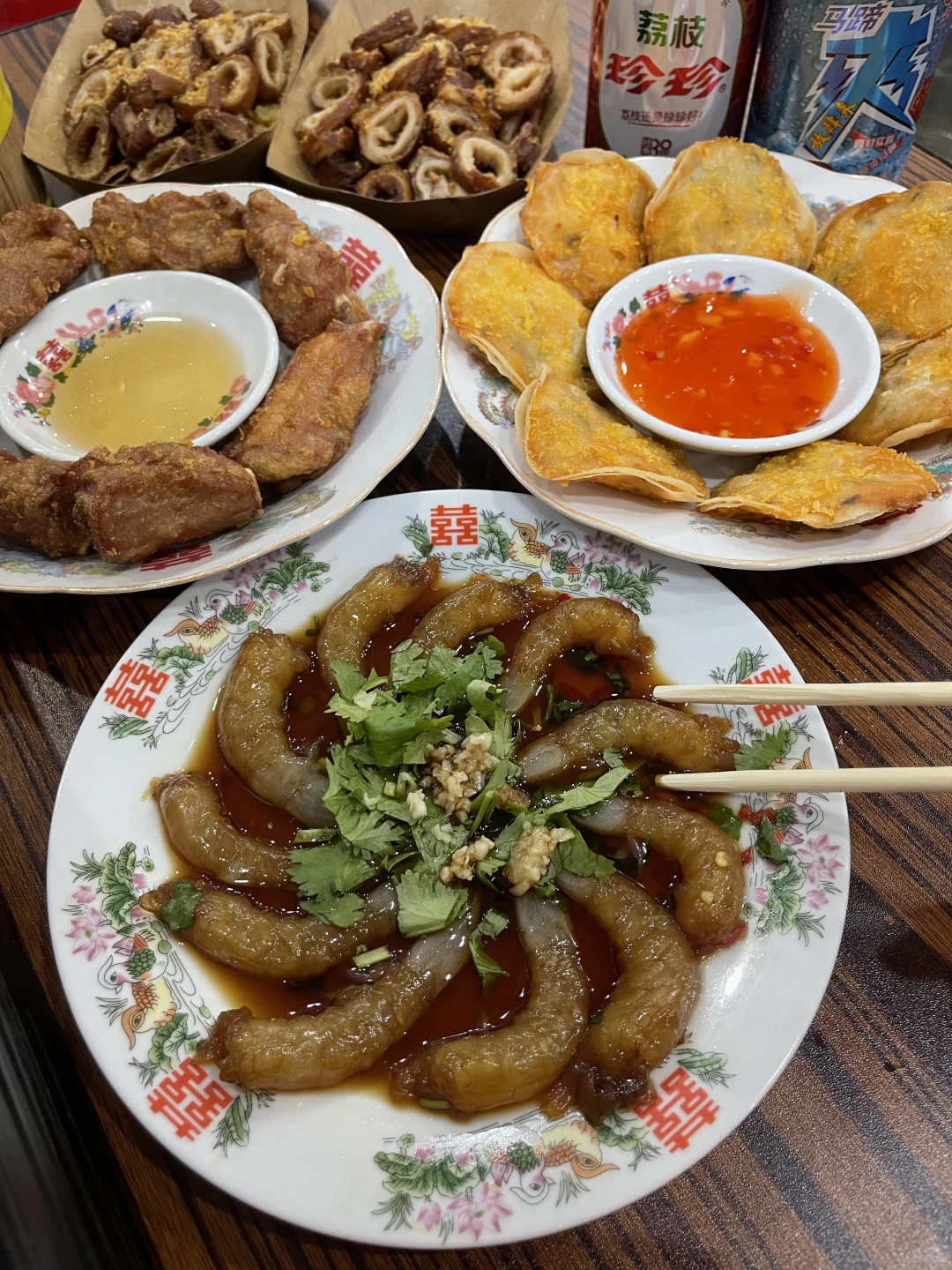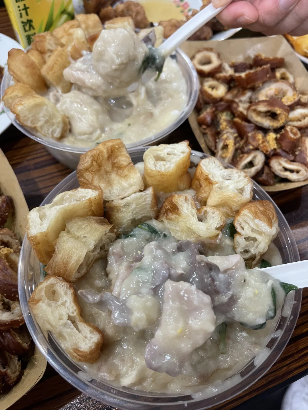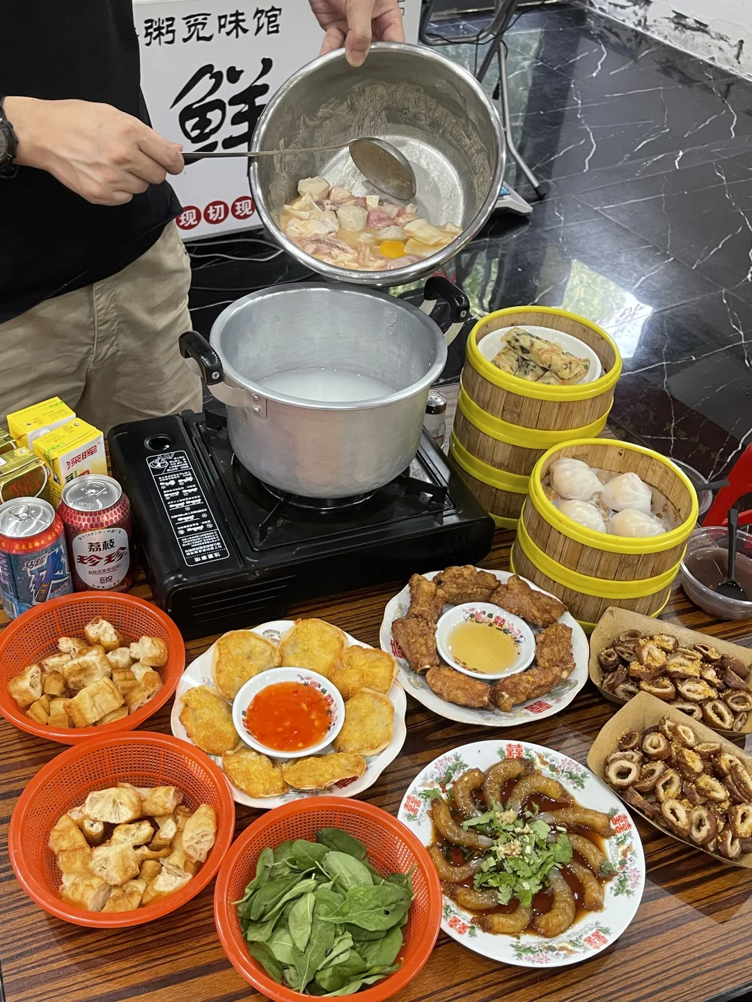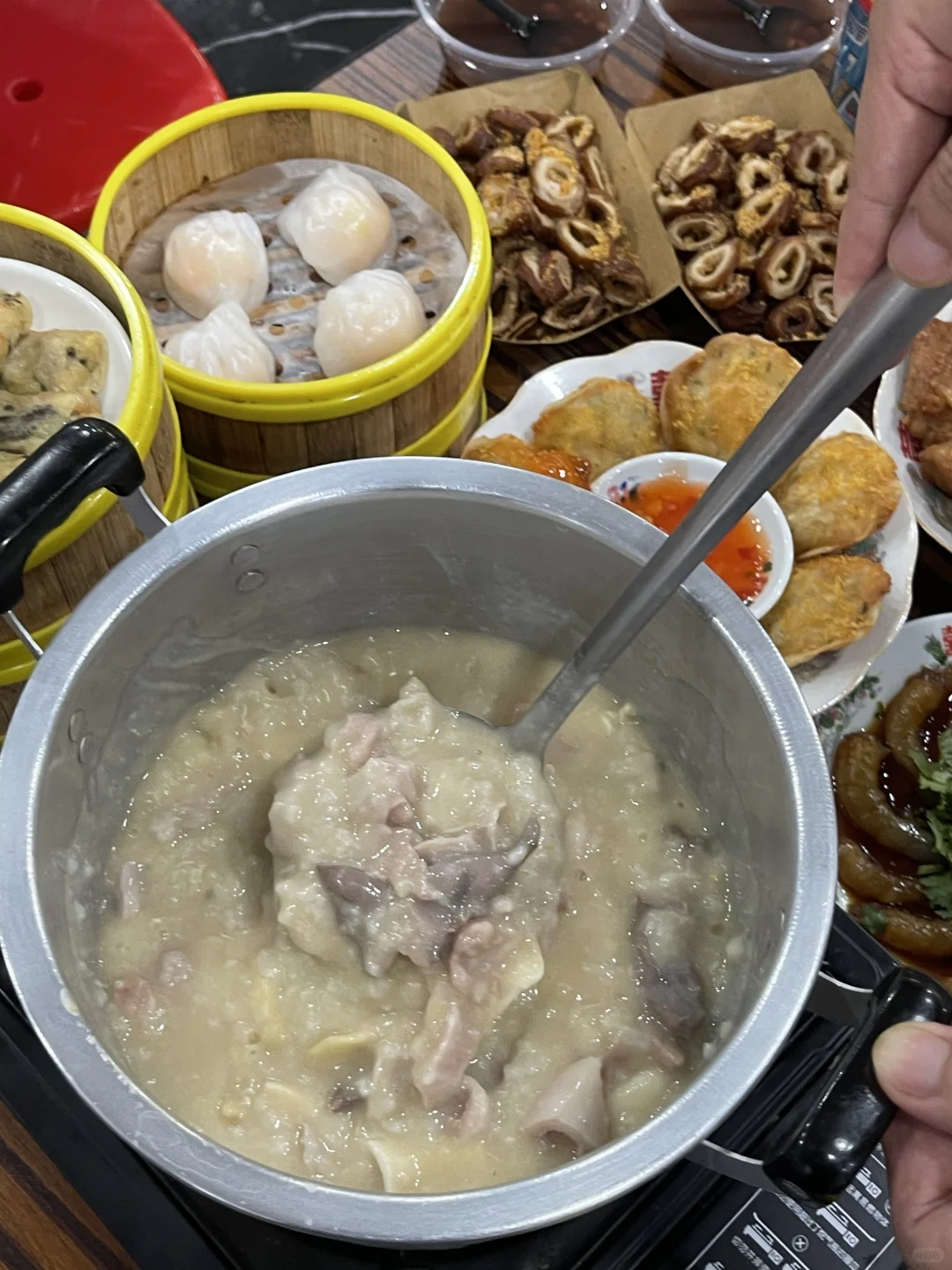 临平新开的 厚嘟嘟的猪杂粥尊嘟好地道、满满老广味 白粥煮开后、倒入新鲜猪杂、料好足! 还加了枸杞叶 吃的时侯再加入油条!美滋滋 脆皮大肠、蒜香排骨、潮汕虾饼……随便点都好吃