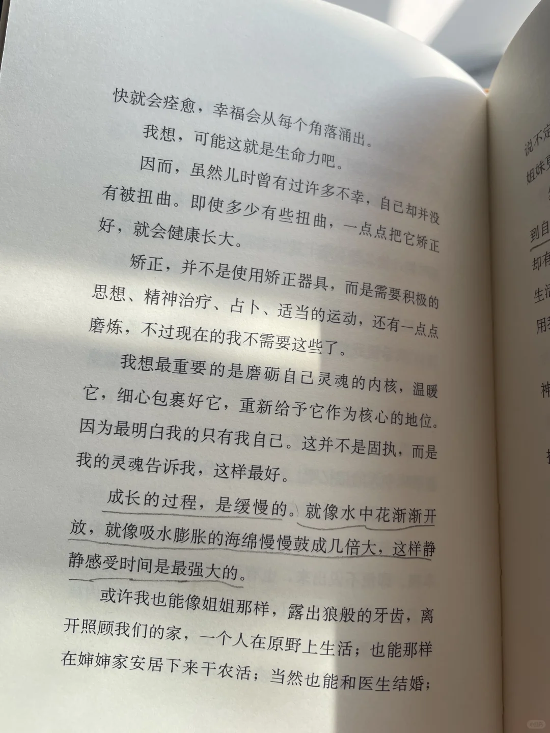 成长的过程,是缓慢的。就像水中花渐渐开放,就像吸水膨胀的海绵慢慢鼓成几倍大,这样静静感受时间是最强大的。”