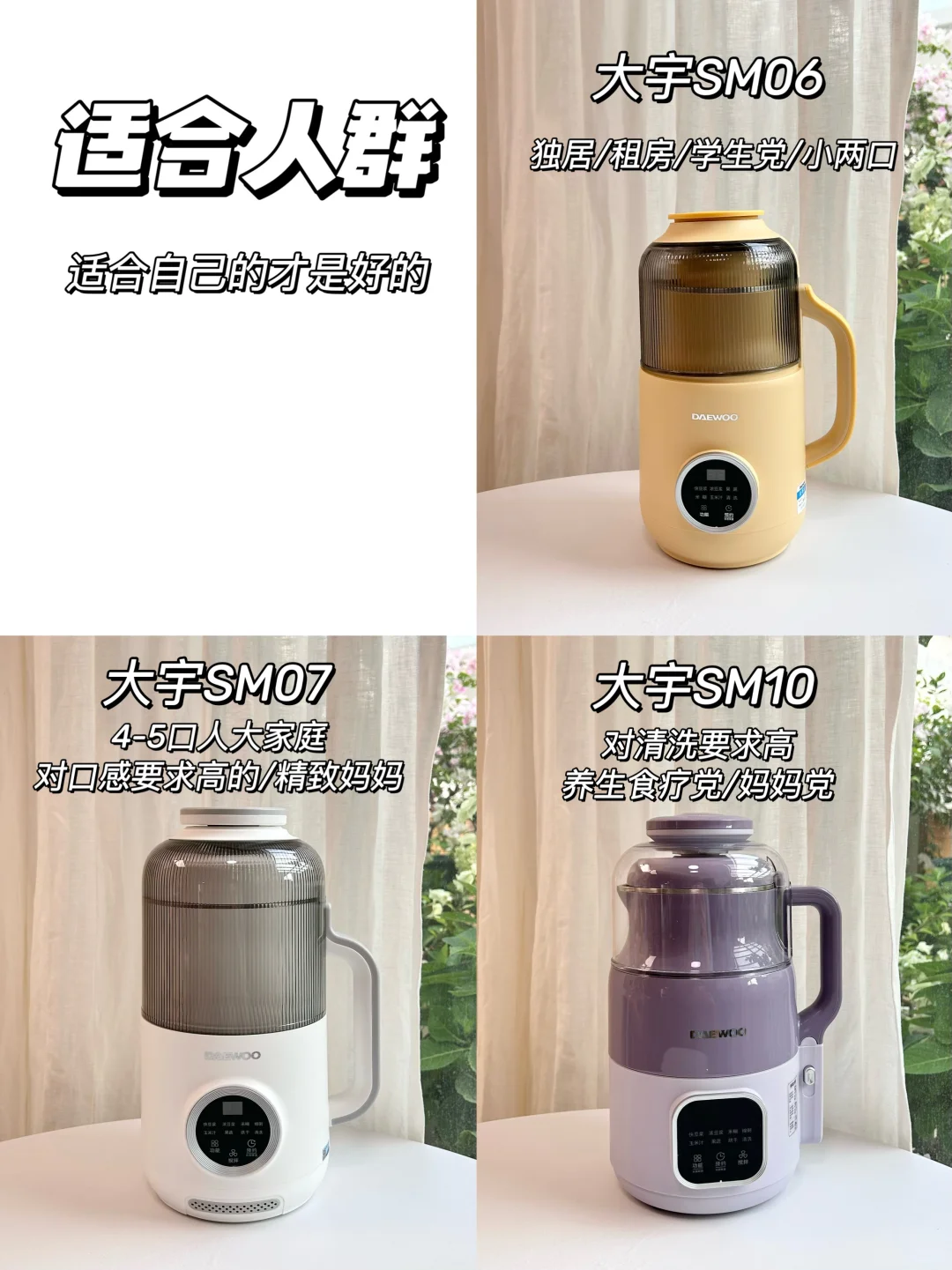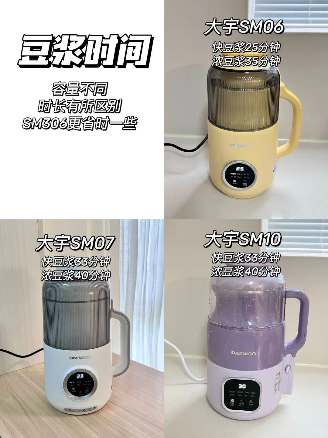 大宇的豆浆机太火了,到底好不好用?哪款更适合自己?今天就选了它家热卖的三款豆浆机:🔺大宇云暮豆浆机SM06、🔺大宇微压豆浆机SM07、🔺大宇可拆洗破壁机SM10来实测🔍,给宝子们一个参考。买对不买贵,选择适合自己的最重要!