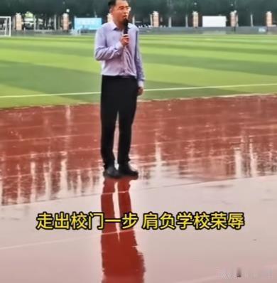 近日,在内蒙古通辽新城一中,一场军训活动遭遇了突如其来的大雨。面对这突如其来的天气变化,年级主任尹老师迅速做出反应,组织学生站到遮雨的看台上避雨,自己则独自站在雨中,开始了领导讲话环节。他大声说道:“一群人,一条心,一起拼,一定赢。走出家门一步,肩负家庭荣辱;走出校门一步,肩负学校荣辱……”尹老师的话语铿锵有力,学生们在看台上认真聆听,场面十分震撼。