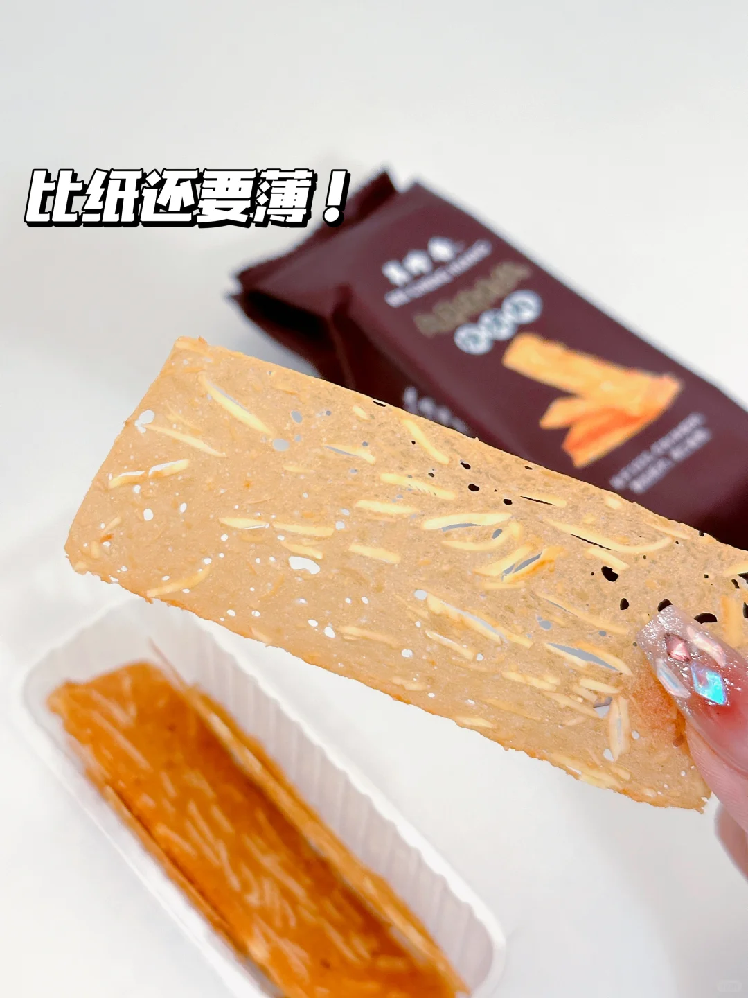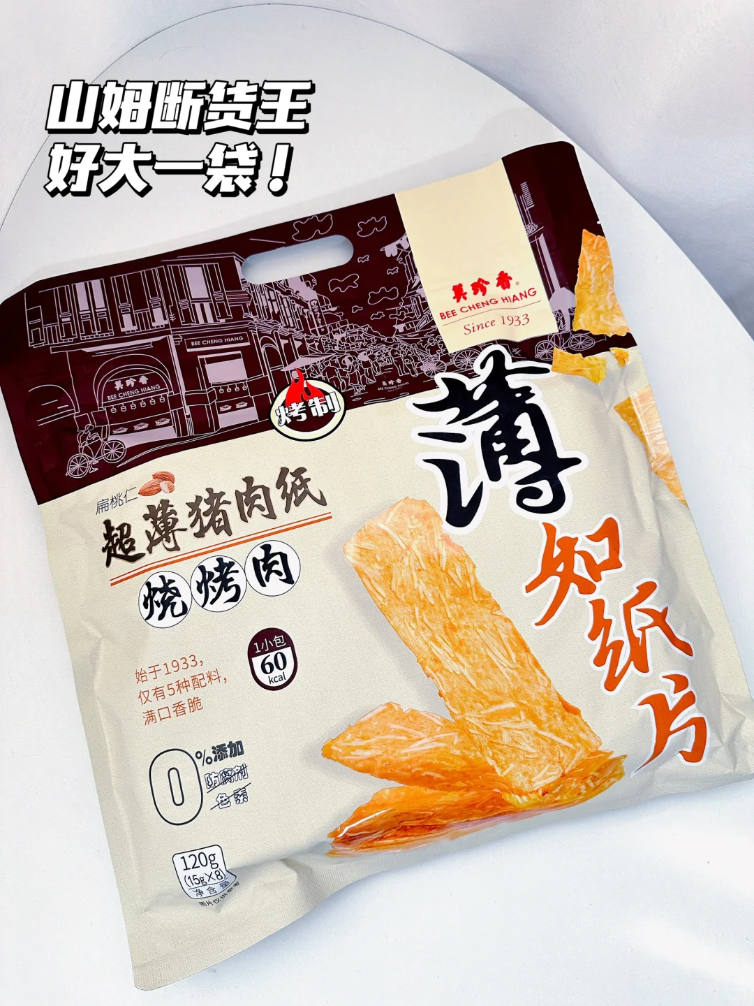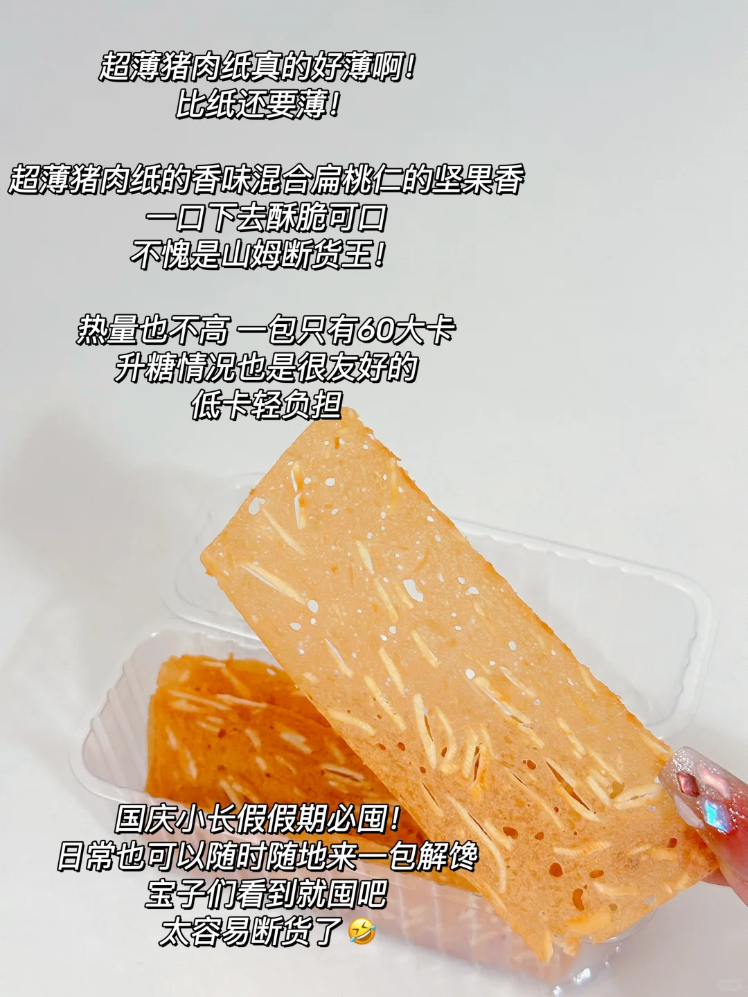 超薄猪肉纸真的好薄啊!比纸还要薄!0添加,配料表也很干净!超薄猪肉纸的香味混合扁桃仁的坚果香,一口下去酥脆可口,不愧是山姆断货王!