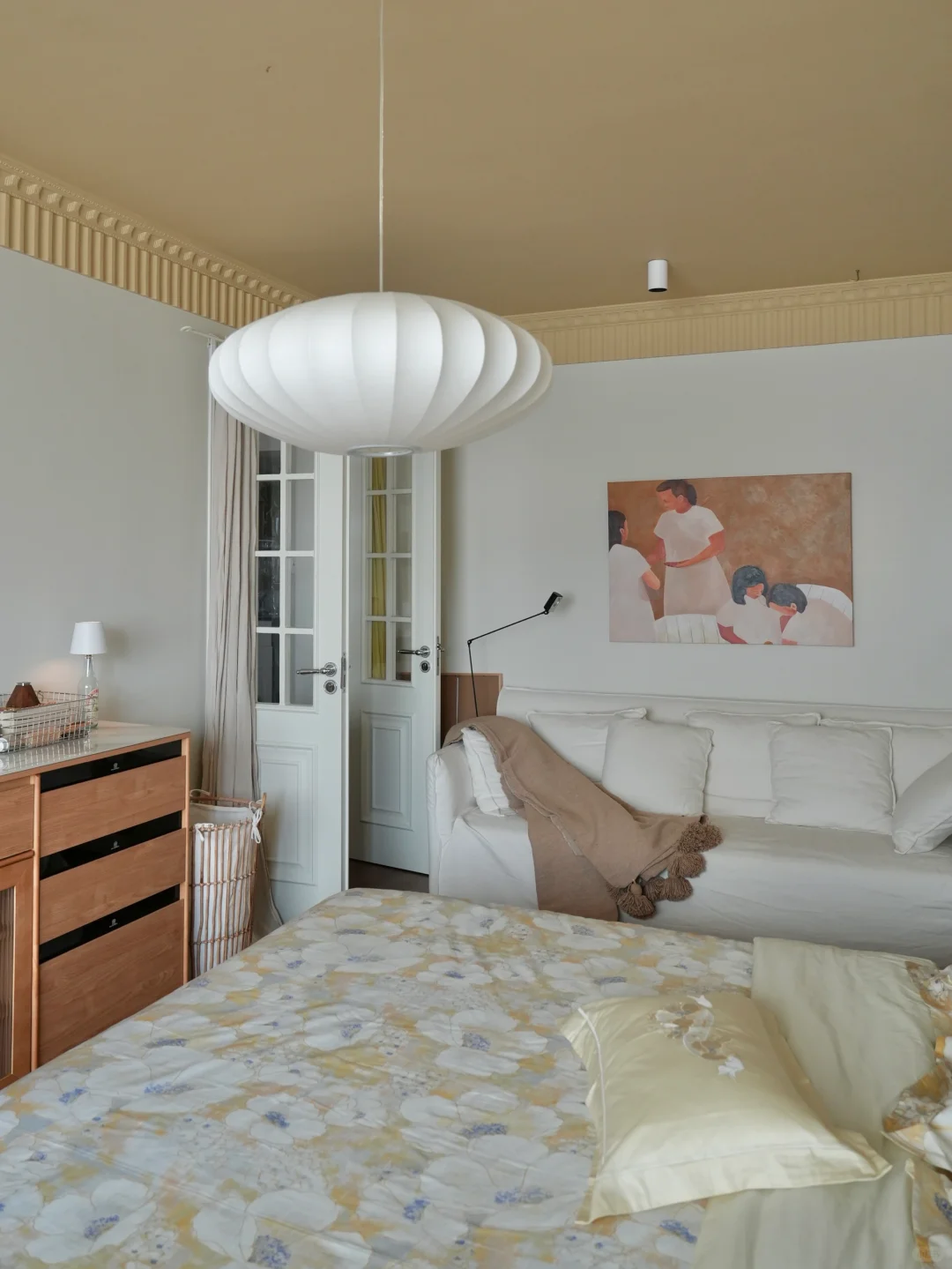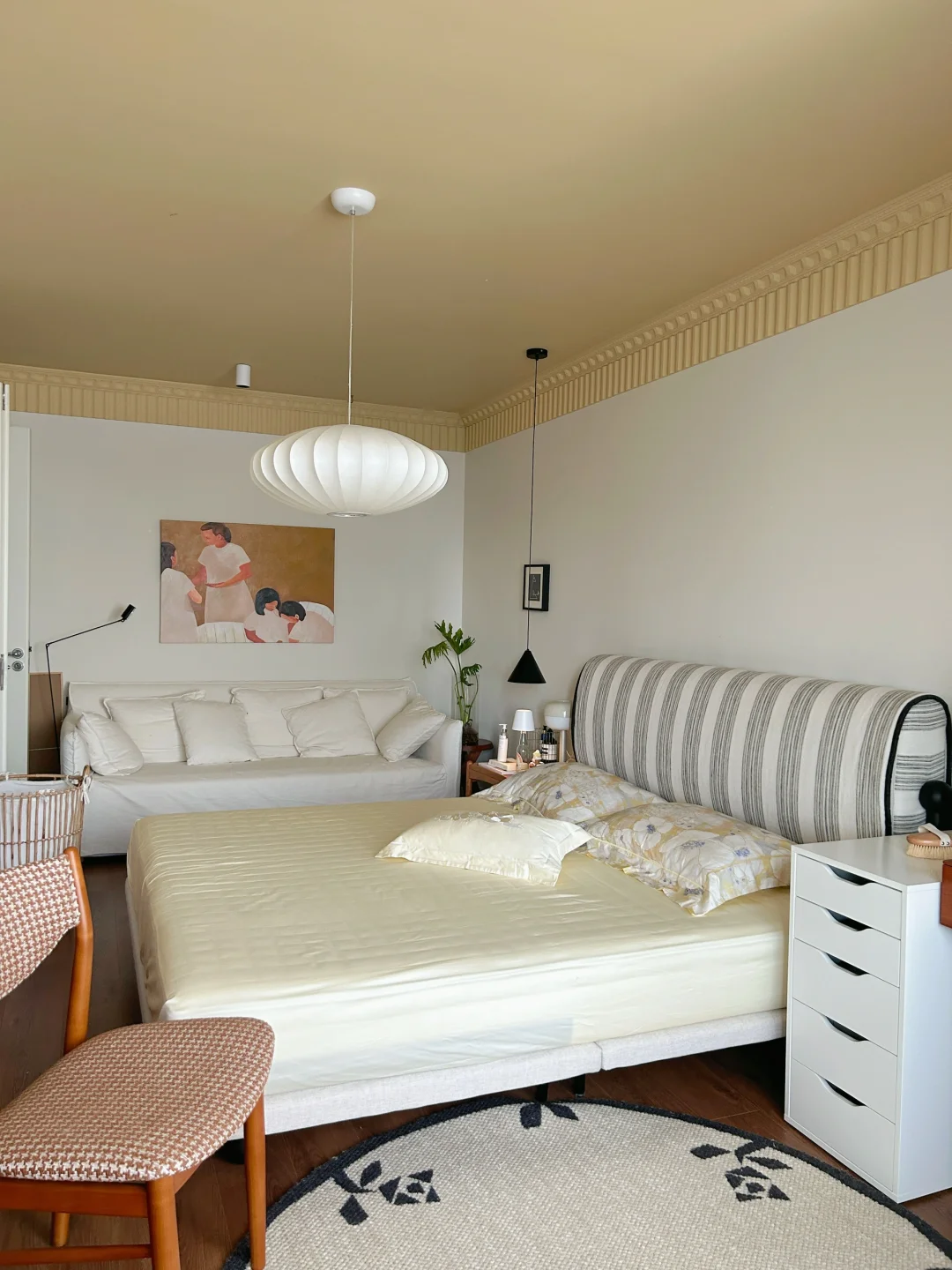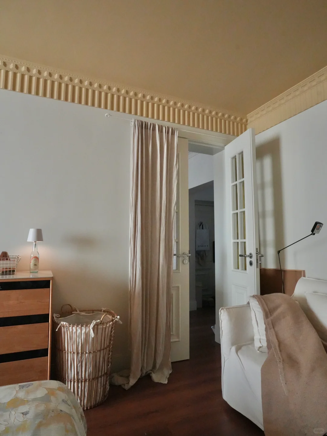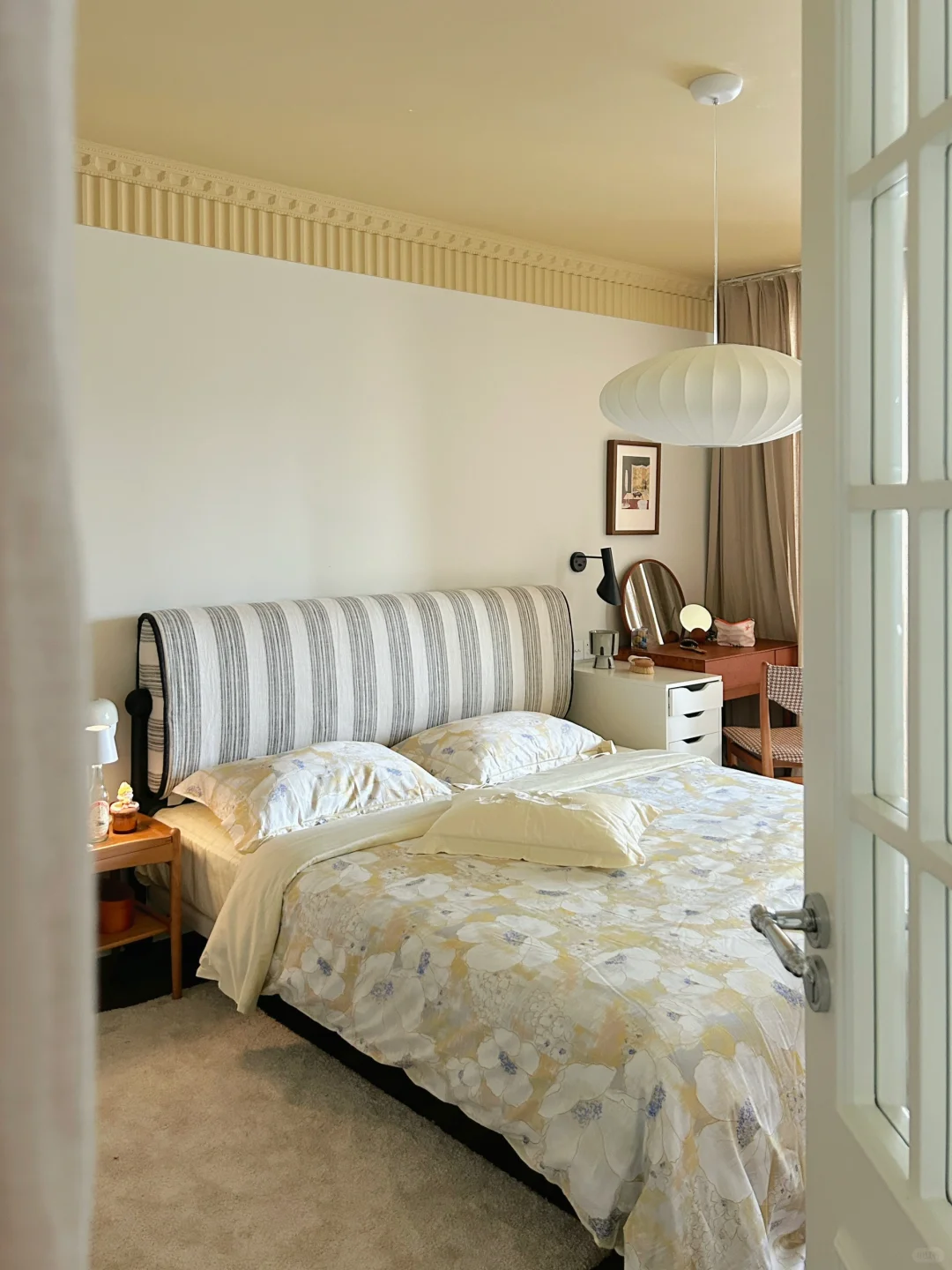 🛏 关于我的卧室: 宽3.1mx长5.3m 集休息,梳妆穿搭,办公于一体 📚从左到右的布局: 1️⃣ 双人沙发 2️⃣ 床和床尾柜 3️⃣ 梳妆台和衣架 4️⃣ 阳台是办公桌和展示柜 因为没有定制柜 可以随着自己的的心情 调整卧室的布局氛围 温柔复古的感觉舒服又静谧 🎨 颜色: 🤍 法式复古的双 开门 💛 黄色石膏线屋顶,装饰画,明亮的奶黄四件套 🤎 木色中古的梳妆台和梳妆椅 🖤 优雅耐看的支吾原野床 床头面料采用37%木天丝+46%细亚麻的材质 比市面上的常规亚麻更加透气亲肤 适合高度的软包床头,平时倚靠更舒服软弹 也采用了可拆洗的设计,不用担心打理问题 床体是AB分区的实木排骨架 除了安装入户便捷省力 整体也是结构稳定不晃动 - 入住一年半了 双开门的款式和颜色也是越看越有质感 波浪线的黄色屋顶赋予了卧室一点子浪漫 整体的单品都寻求复古浅色的低饱和,温润耐看 -