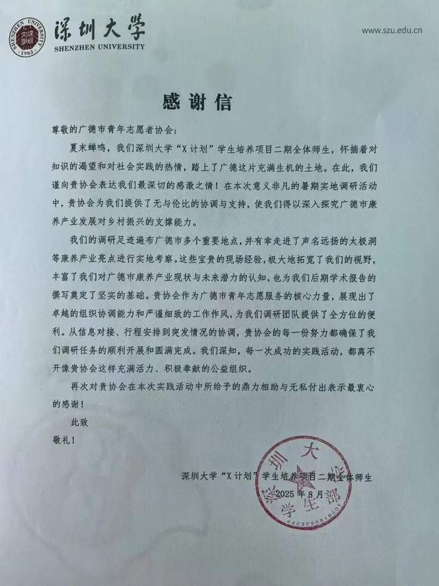近日,深圳大学“X计划”学生培养项目二期师生在广德开展了社会实践活动。期间,得到了广德市青年志愿者协会志愿者们的帮助支持,使得实践活动能够顺利进行,取得了满意的效果。回到学校后,师生们怀着感激之情,给广德市青年志愿者协会写了一封感谢信(见下面图片)。