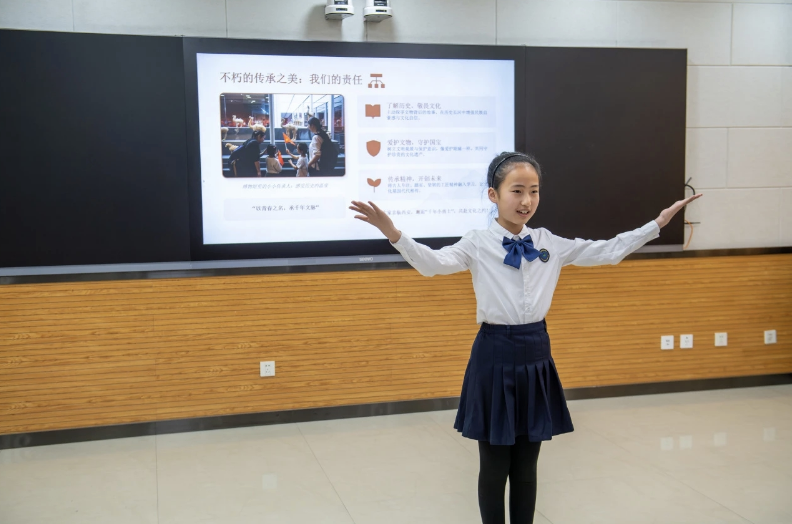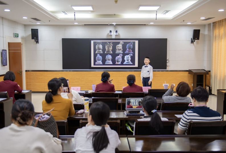 比赛中,小志愿者们精神饱满、自信登台,有的手指展板,模拟站在兵马俑坑前的导游;有的微微侧身,眼神专注地望向“观众”,仿佛置身于浩浩荡荡的秦俑军阵之间。一位小选手讲到秦始皇统一度量衡时,双手比划着尺与斗的形状,声音清亮而笃定;另一位选手则借助一块自制的陶俑模型,将秦代工匠的智慧娓娓道来,引得台下观众频频点头。