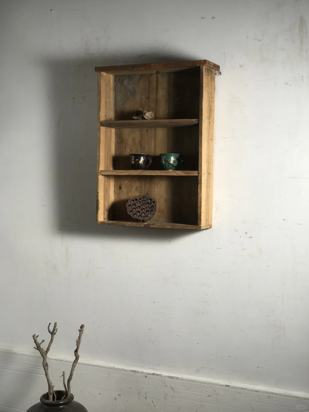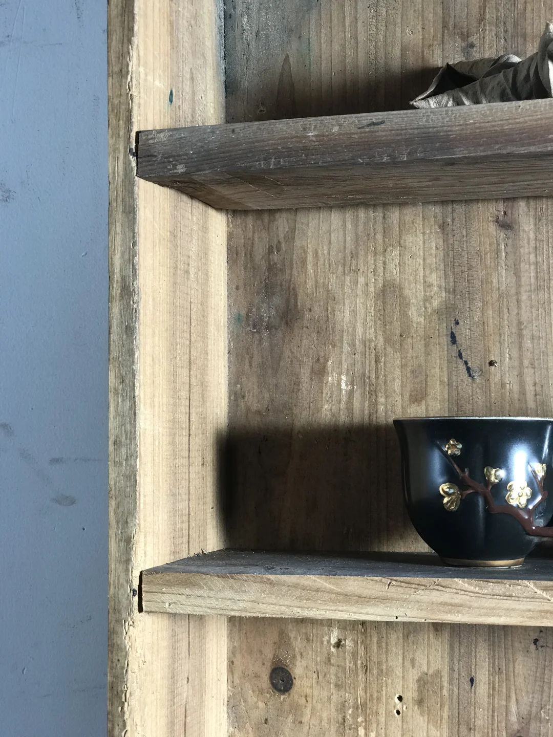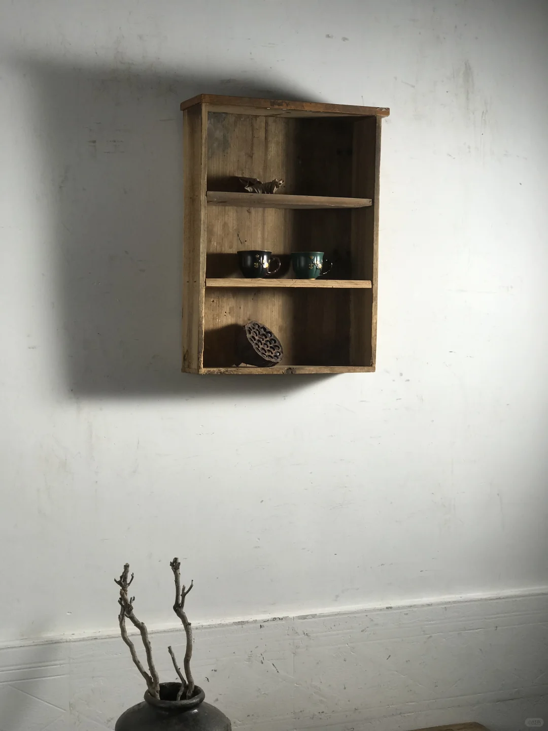 茶具柜、壁挂置物格;民宿、茶室等极简侘寂软摆件;45*32*9厘米深。旧料手工改造,略显粗糙。