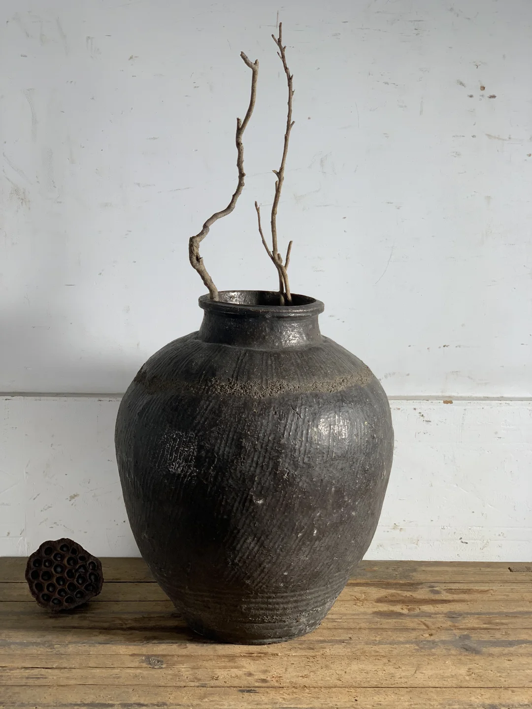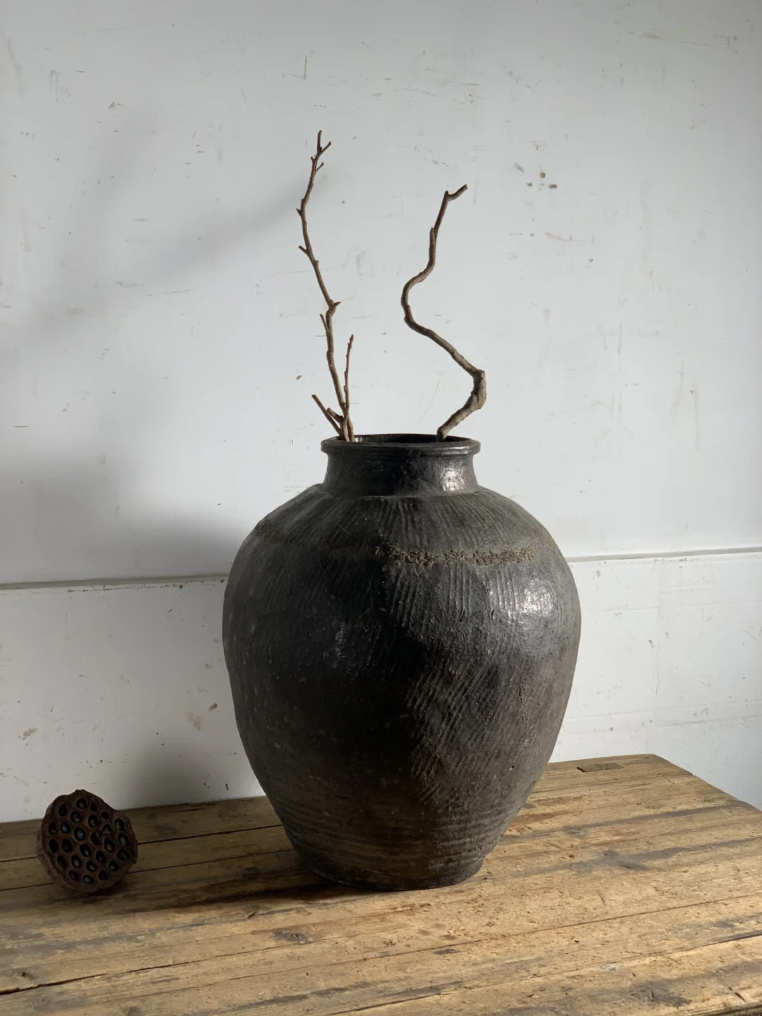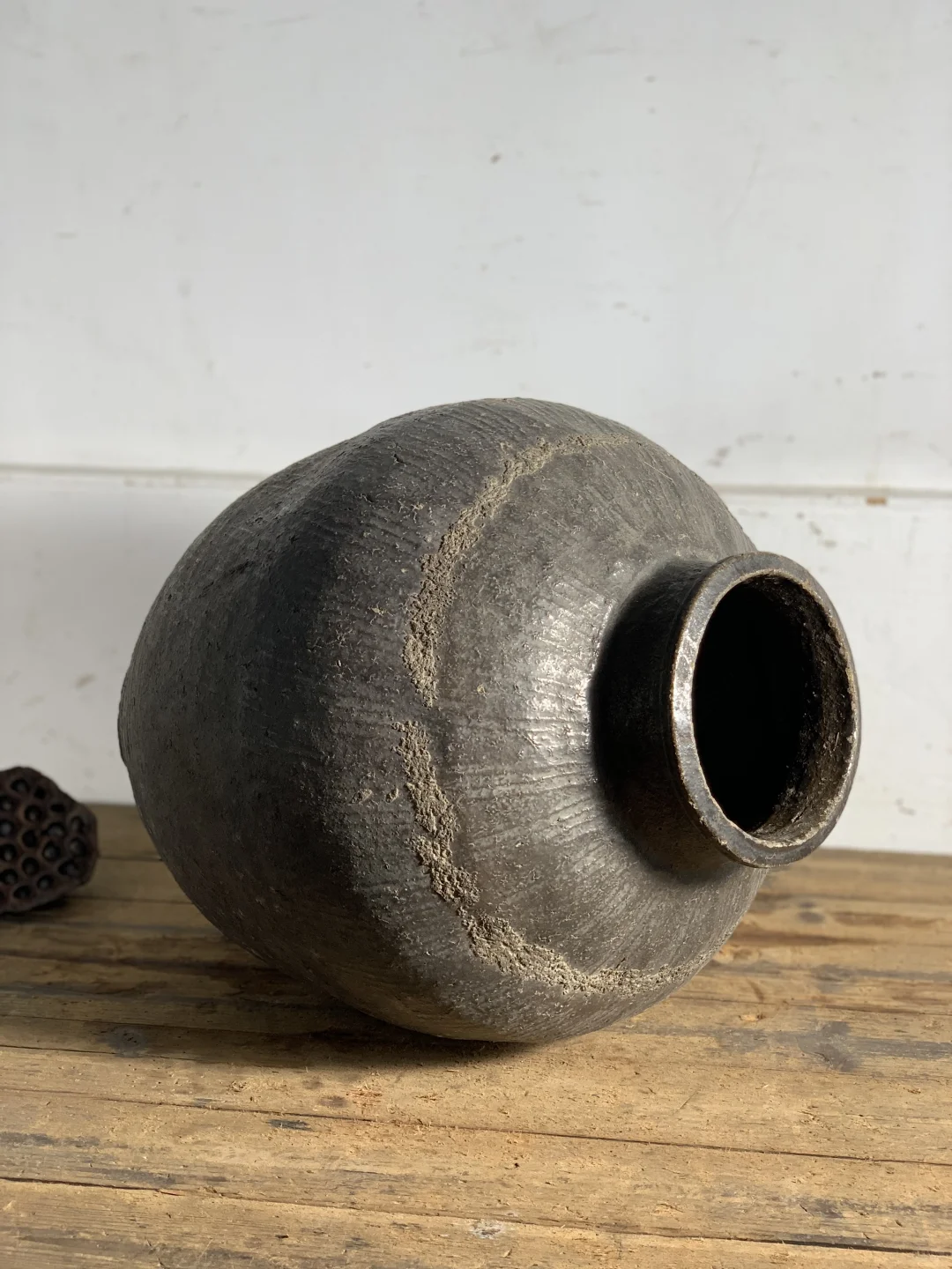 螺纹老陶罐、包浆佳,插花花器;民宿、书房、茶室极简侘寂摆件;30*30*40厘米高,口径12厘米宽。