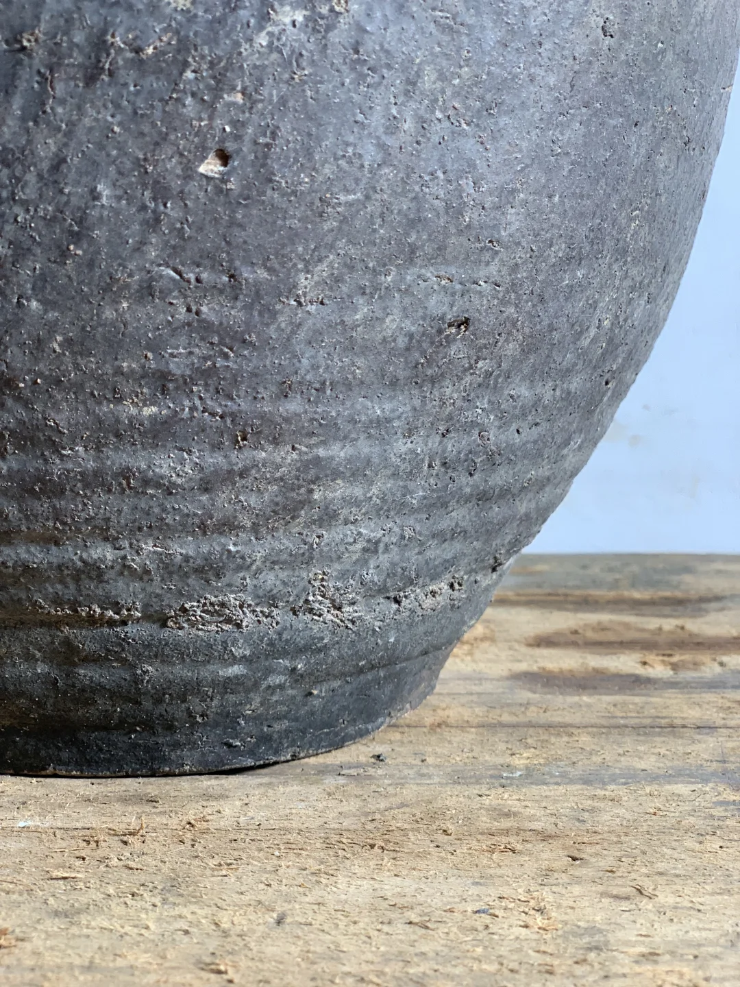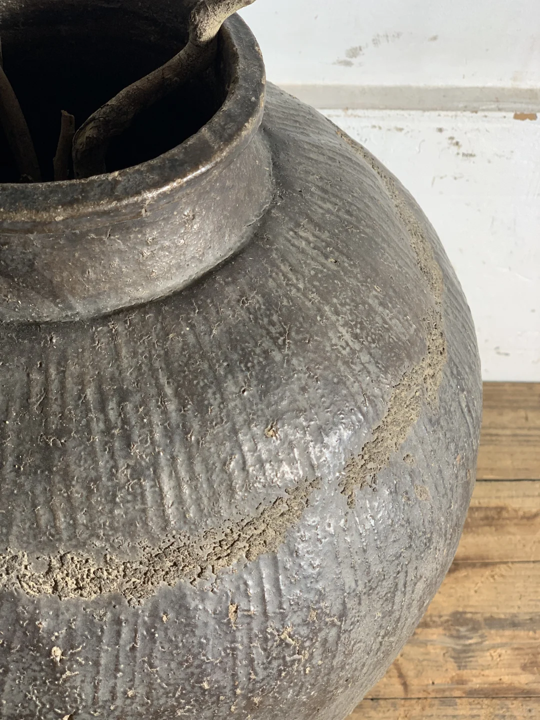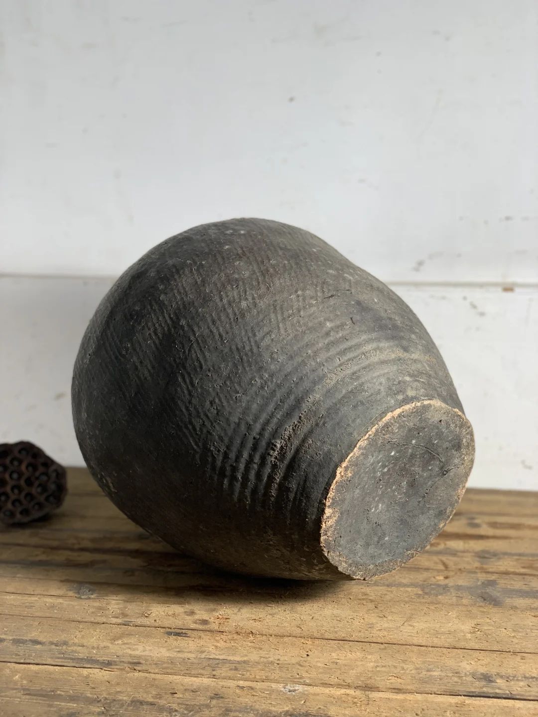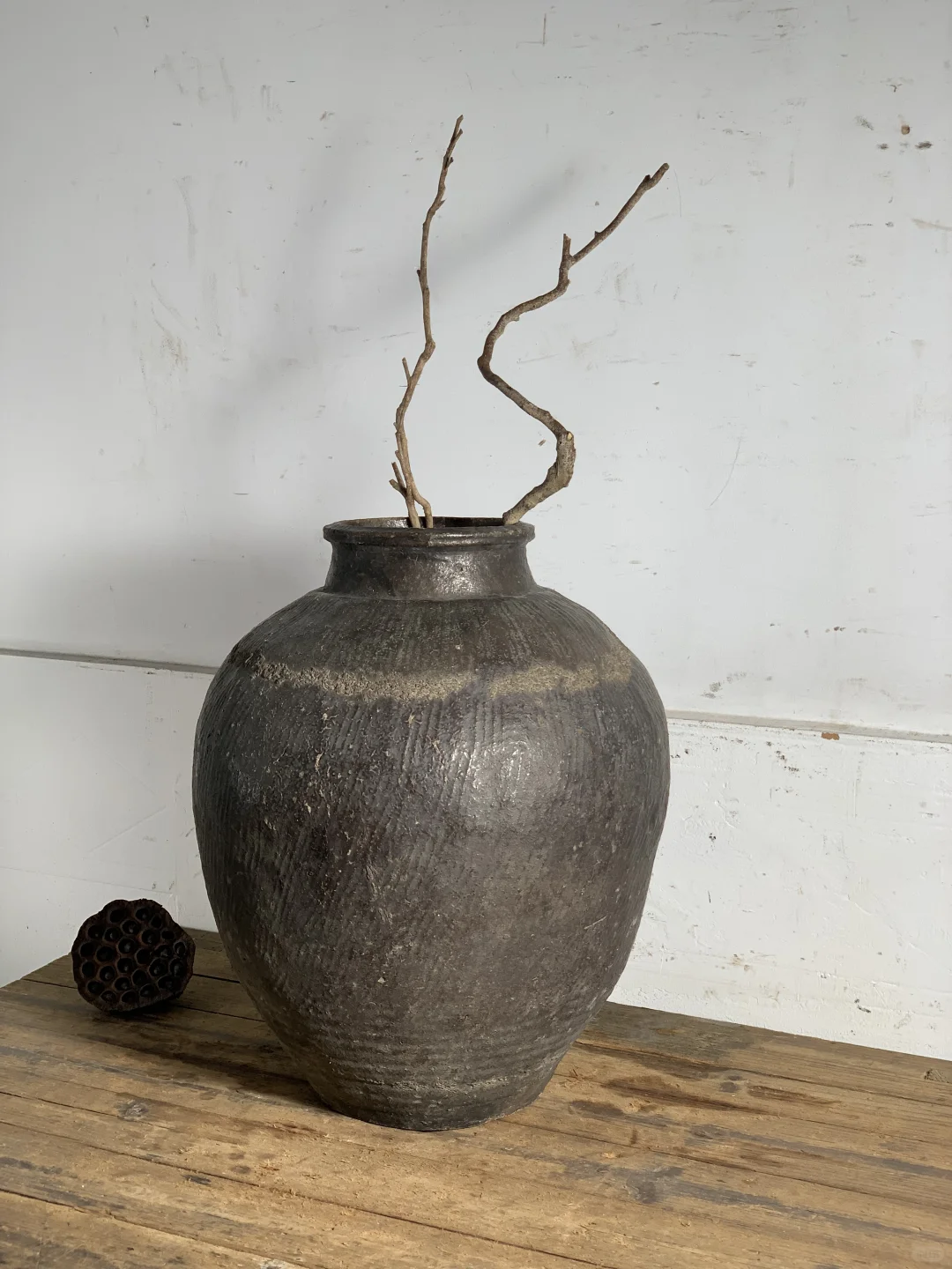 螺纹老陶罐、包浆佳,插花花器;民宿、书房、茶室极简侘寂摆件;30*30*40厘米高,口径12厘米宽。