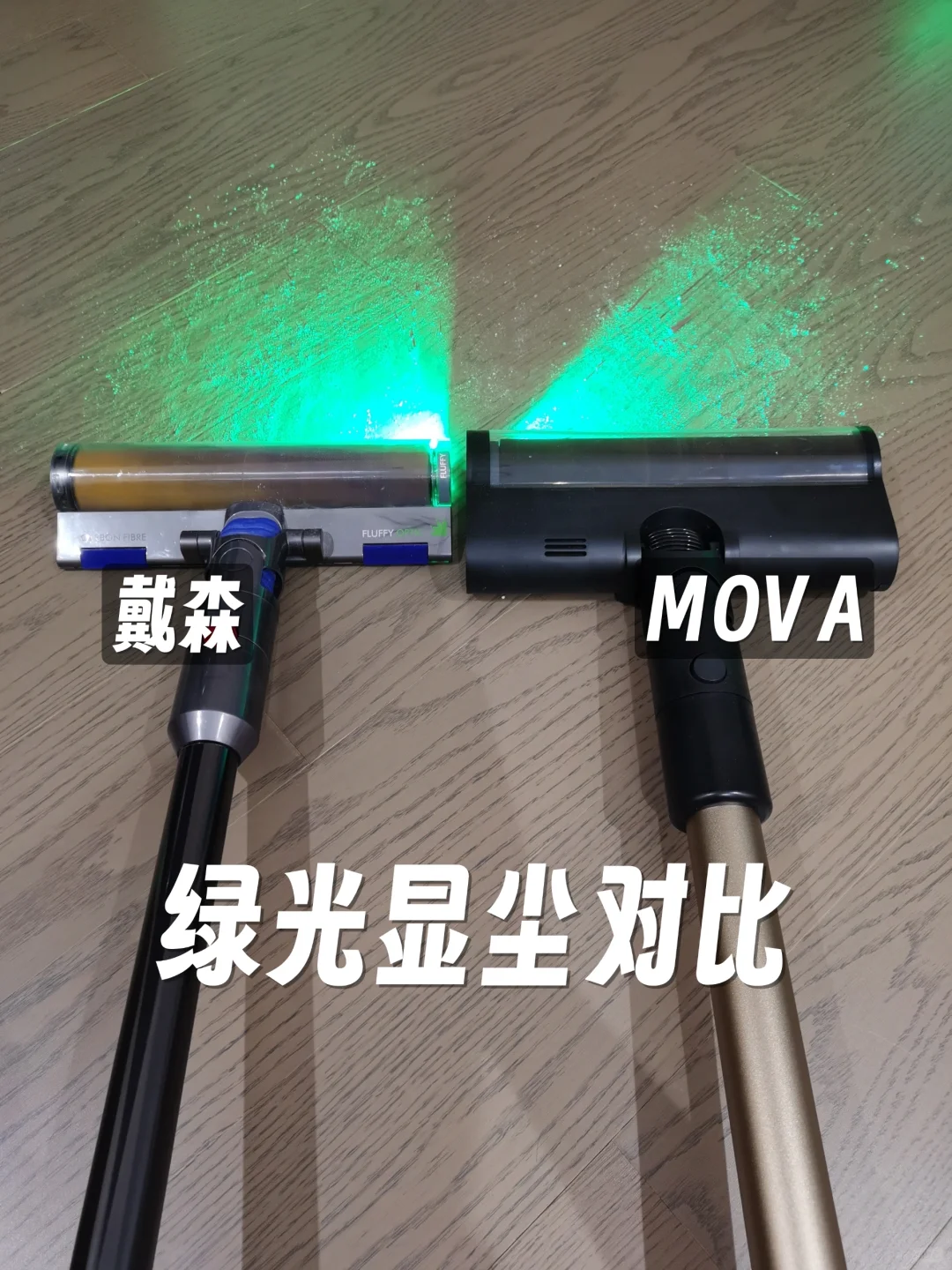 4⃣️、光学探测&灰尘感应:两者都支持绿光显尘,把肉眼看不到的灰尘脏污消除干净,显尘面积戴森更大,但是MovaS5的显尘清晰度更好一些;且都支持智能化调节吸力,根据灰尘情况吸力自调节,兼顾续航和效率。