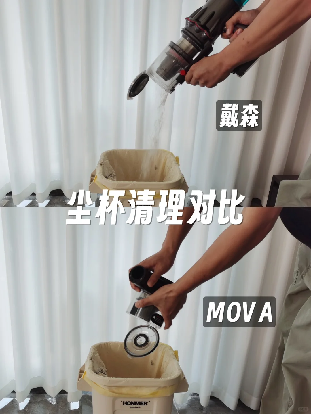 [清单R]顺便提一下,两者尘杯的清理方式也不一样:MovaS5是一键倒垃圾不扬灰,一键拆除清洗,戴森的是一体推拉式的很容易把垃圾倒到垃圾桶以外的地方。