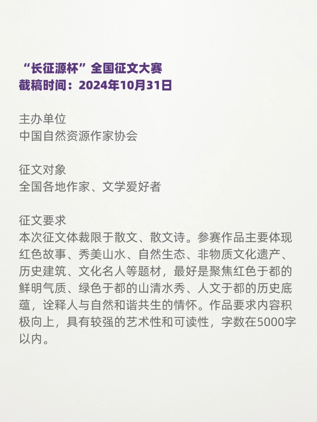 本次征文体裁限于散文、散文诗。参赛作品主要体现红色故事、秀美山水、自然生态、非物质文化遗产、历史建筑、文化名人等题材,最好是聚焦红色于都的鲜明气质、绿色于都的山清水秀、人文于都的历史底蕴,诠释人与自然和谐共生的情怀。作品要求内容积极向上,具有较强的艺术性和可读性,字数在5000字以内。