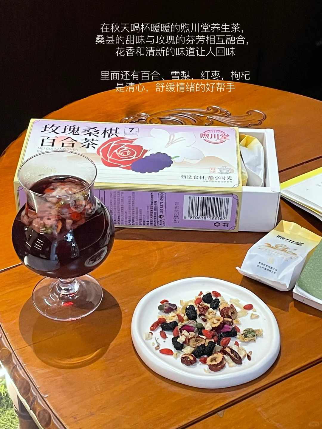 在秋天喝杯暖暖的煦川堂养生茶,桑葚的甜味与玫瑰的芬芳相互融合,花香和清新的味道让人回味,里面还有百合、雪梨,红枣,是清心,舒缓情绪的好帮手。