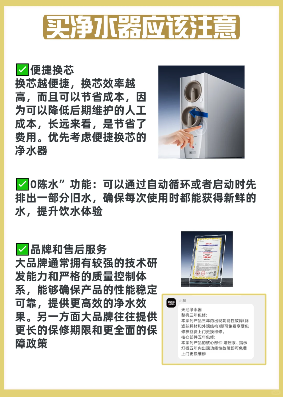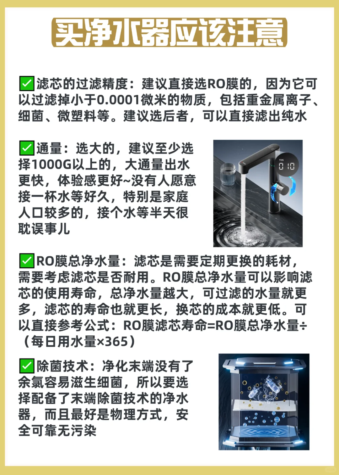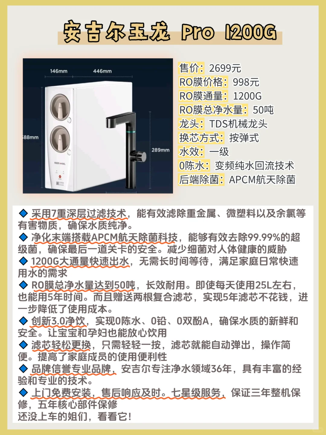 家里接的水有一些沉淀物,吓得我赶紧上网搜净水器的攻略。不查不知道,原来净水器这么多门道,现在知道的也不晚,如果也有和我一样想入手净水器的人可以看看我整理的选购攻略,另外我自己深度测评了几款热门净水器,大家可以对比一下 选购净水器我们需要关注的要点👇: ✅滤芯过滤精度 ✅大通量 ✅RO膜总净水量 ✅除菌技术 ✅便捷换芯 ✅0陈水”功能 ✅品牌和售后服务 结合以上要点和测评结果,我选择了肖战代言的安吉尔玉龙Pro 1200G。 🔹采用7重深层过滤技术,能有效滤除重金属、微塑料以及余氯等有害物质,确保水质纯净。 🔹净化末端搭载APCM航天除菌科技,能够有效去除99.99%的超级菌,确保最后一道关卡的安全。减少细菌对人体健康的威胁 🔹1200G大通量快速出水,无需长时间等待,满足家庭日常快速用水的需求 🔹RO膜总净水量达到50吨,长效耐用。即使每天使用25L左右,也能用5年时间。而且赠送两根复合滤芯,实现5年滤芯不花钱,进一步降低了使用成本。 🔹创新3.0净饮,实现0陈水、0铅、0双酚A,确保水质的新鲜和安全。让宝宝和孕妇也能放心饮用 🔹滤芯轻松更换,只需轻轻一按,滤芯就能自动弹出,操作简便。提高了家庭成员的使用便利性 🔹品牌信誉专业品牌,安吉尔专注净水领域36年,具有丰富的经验和专业的技术。 🔹上门免费安装,售后响应及时。七星级服务,保证三年整机保修,五年核心部件保修 还没上车的姐们,看看它!
