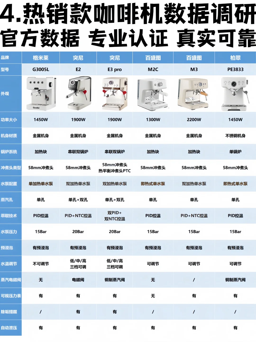 半自动咖啡机大牌热销款,关键数据来源于官方,真实可靠哦,这些数据商家都是经过专业机构检测认证基本不会假,值得参考,有问题可以问我哦。