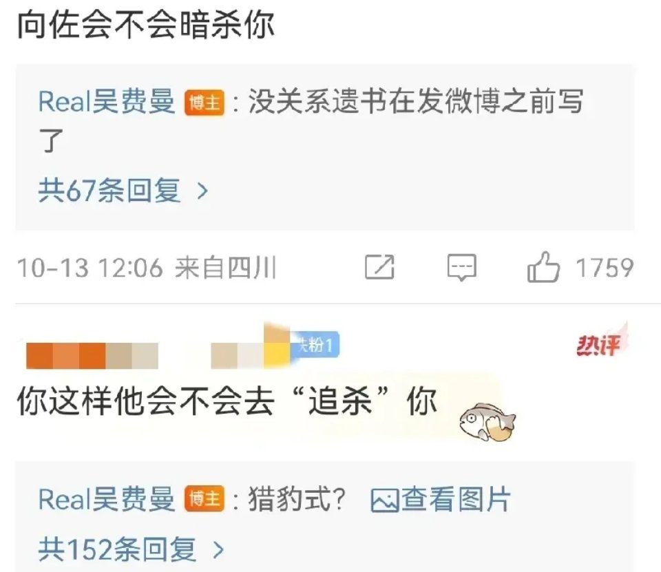 #费曼模仿向佐#10月13日,吴镇宇的儿子吴费曼模仿向佐摸鼻梁的动作后,网友问他:“向佐会不会暗杀你?”吴费曼:“没关系遗书在发微博之前写了。”