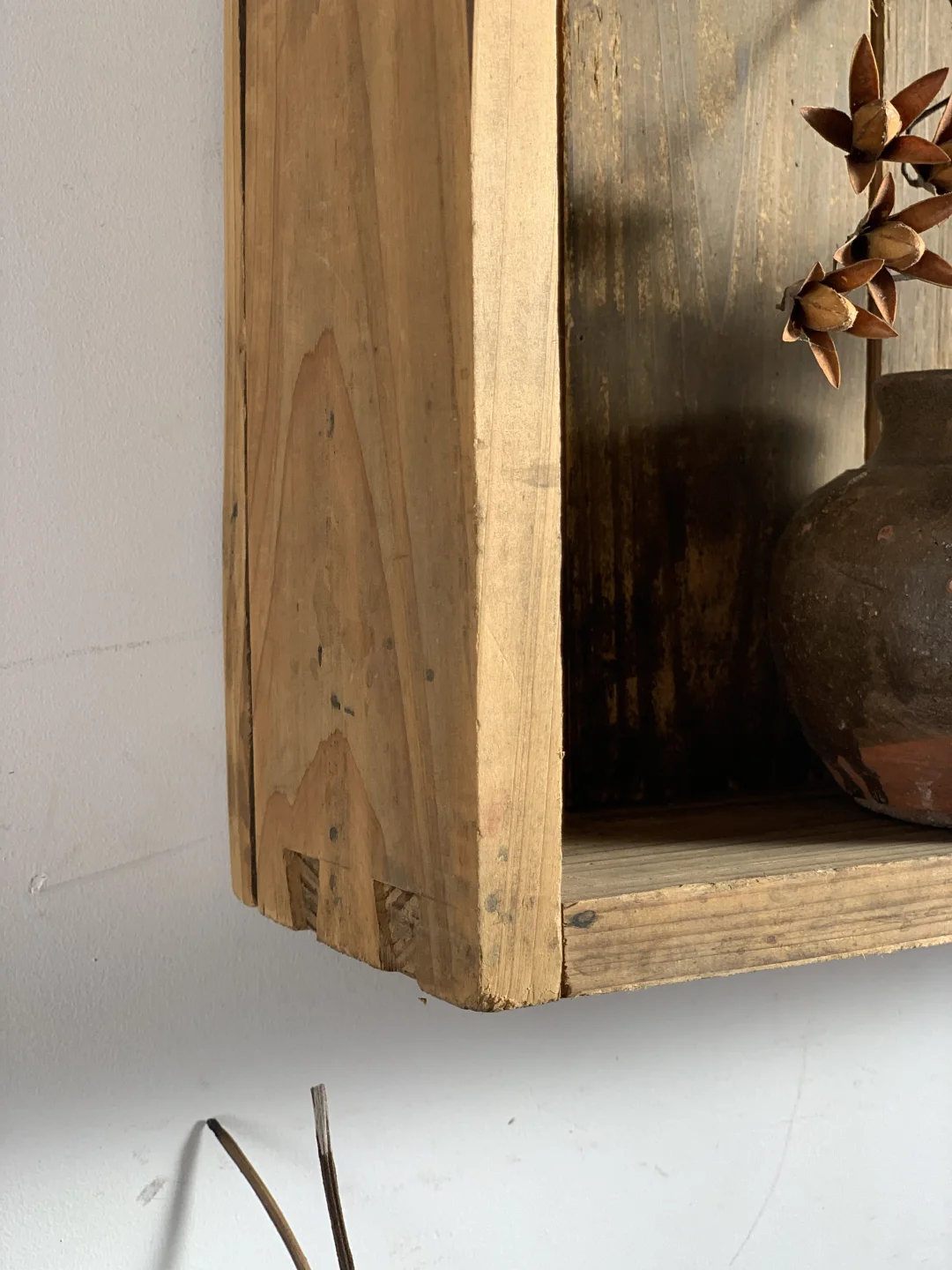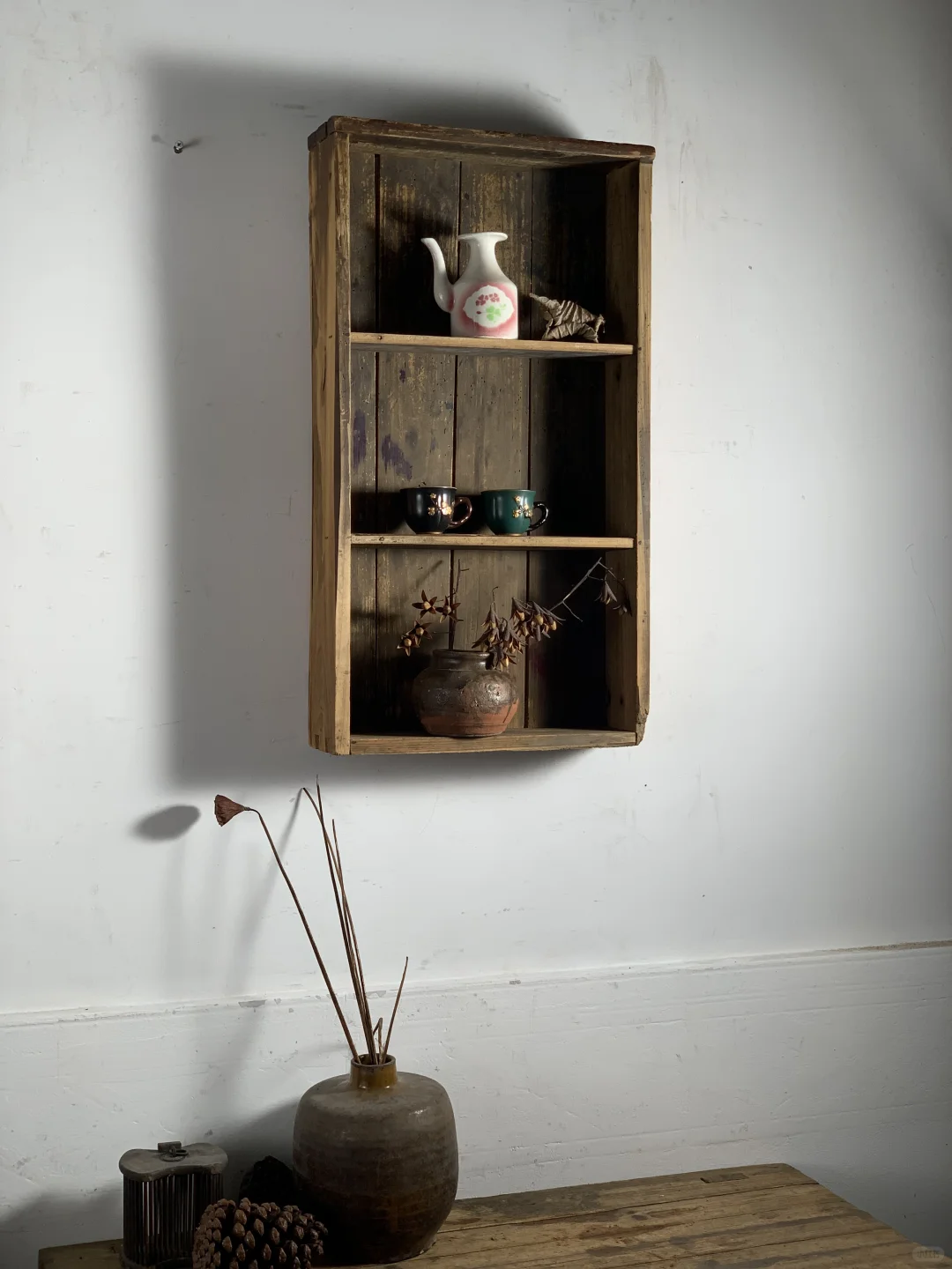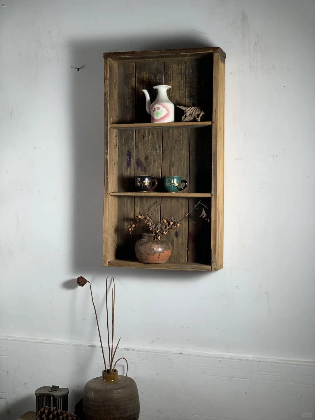 小壁柜、茶具柜、展示柜;自然风化木纹理,极简侘寂软装挂件,民宿、书房、茶室展示,墙上置物;62*34*10厘米深。