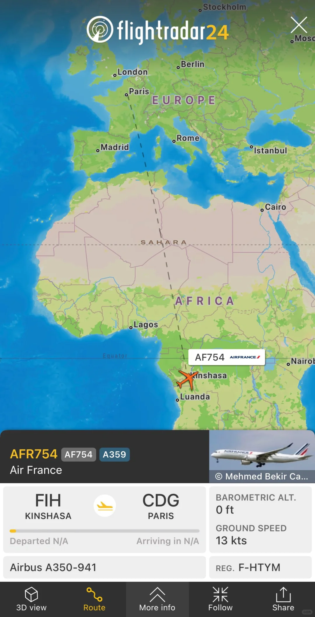 法航AF754 布拉柴维尔-金沙萨-巴黎航线。 第一段布拉柴维尔-金沙萨直线距离26公里,飞机是刚起飞就要降落。