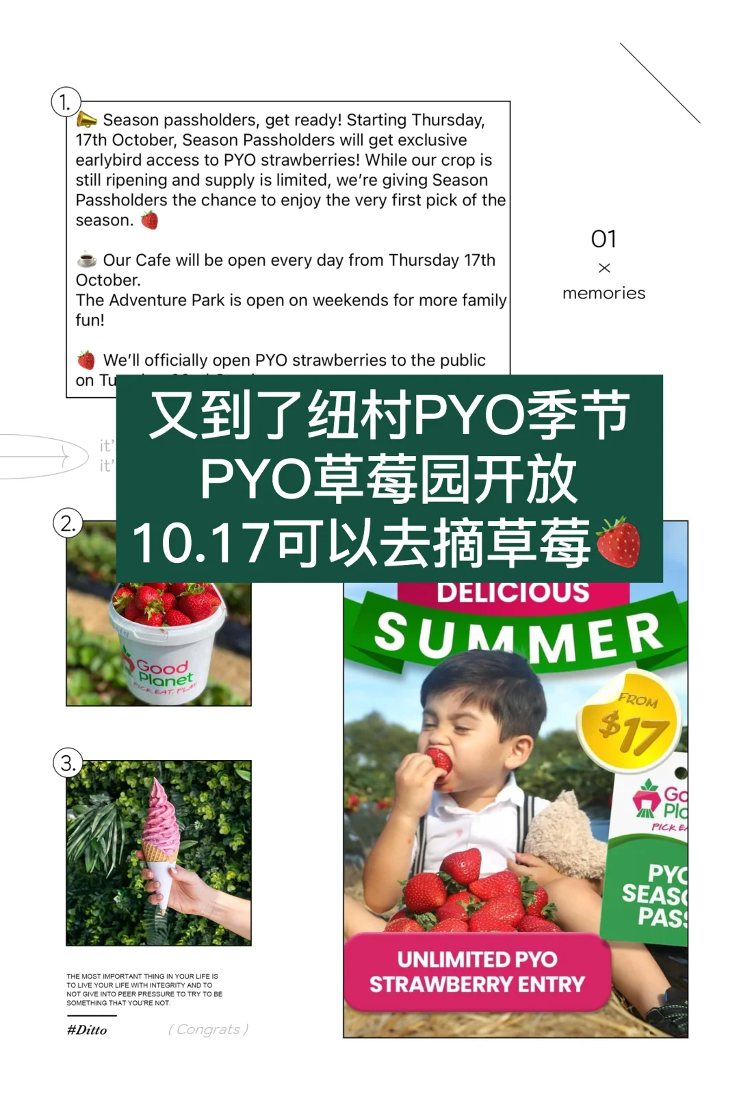 纽村最大PYO的草莓园good planet即将开放!今年还推出了季票优惠! 🍓 全季不限次数自行采摘草莓 🍓 每采摘一桶草莓可享受5%的折扣 🍓 农场内任意消费的💰10代金券 🍓 提前入场 - 避开人群,率先采摘最佳草莓 🍓 仅限持卡人享受的专属折扣与优惠! 儿童季票💰17美元,成人季票💰32 购买了季票的可以在10.17号提前入园采集[哇R][哇R] 没有购买季票的等10.22号全面开放[蹲后续H] 关注我,下一篇更精彩